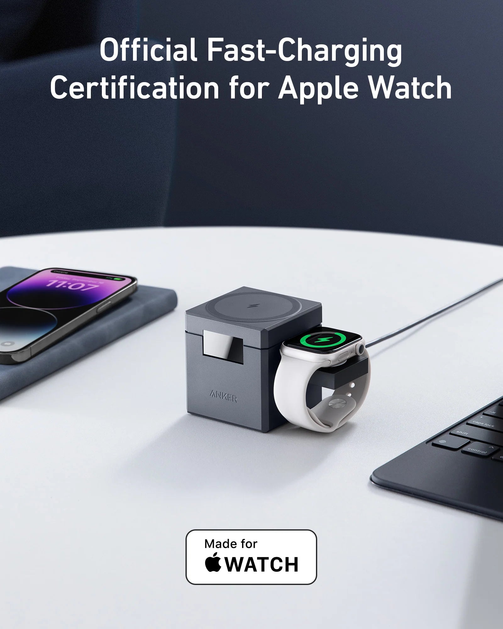 استمتع بتجربة شحن متكاملة مع أنكر 3 في 1 Cube مع MagSafe – الحل المثالي لشحن iPhone، Apple Watch، وAirPods في نفس الوقت، وبشكل أنيق ومريح.