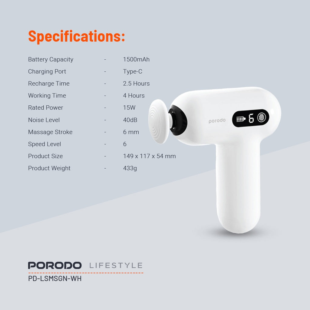 - بورودو لايف ستايل مسدس مساج صغير مع 4 رؤوس - ابيض | Porodo Lifestyle Mini Massage Gun with 4 Head – White.