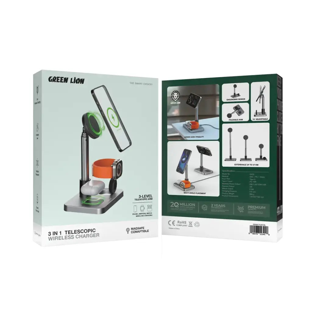 - شاحن جرين لايون اللاسلكي 3 في 1 بتصميم تلسكوبي - فضي | Green Lion 3 in 1 Telescopic Wireless Charger – Silver