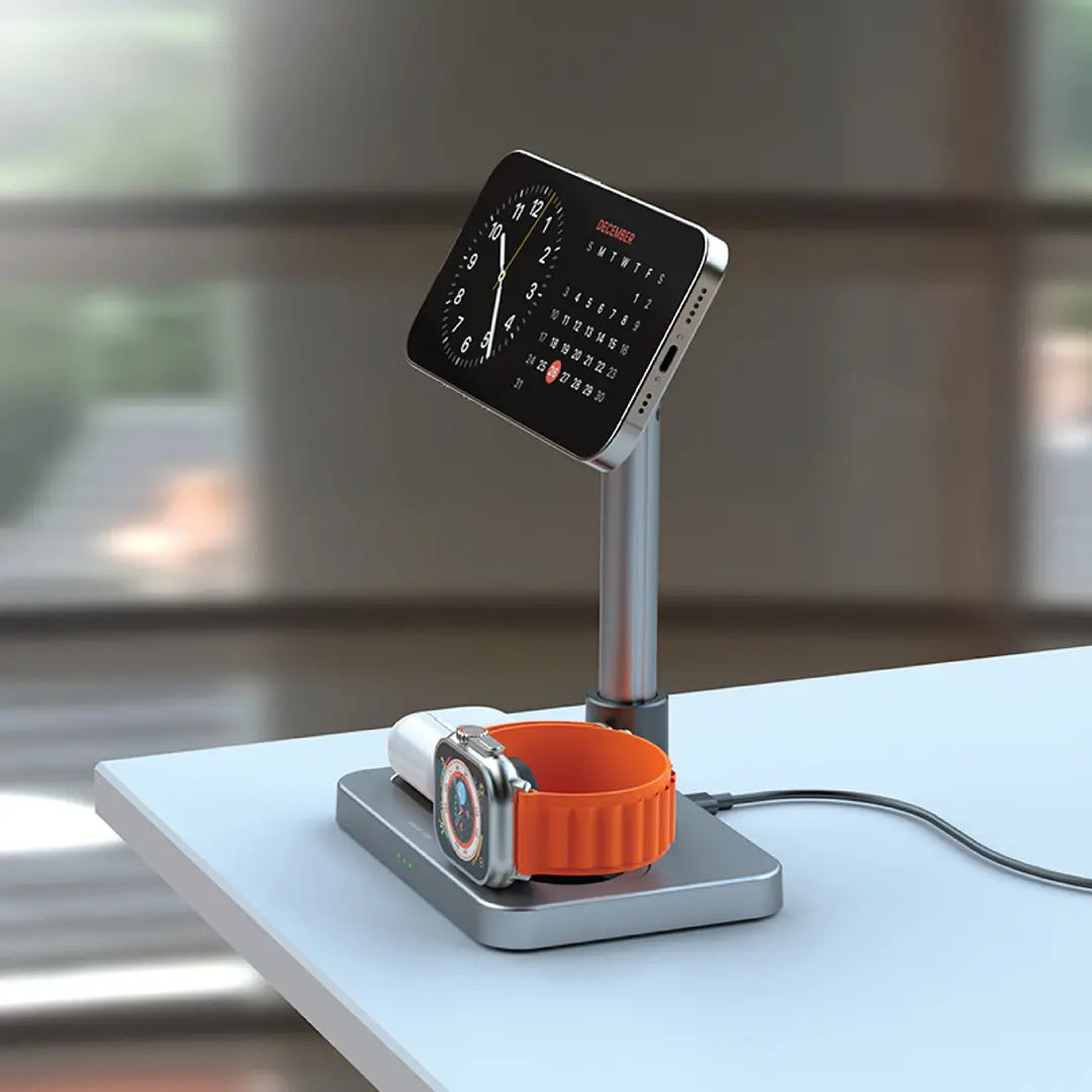 يوفر الشحن اللاسلكي بقوة 15 واط للهواتف، و5 واط لسماعات AirPods، و2.5 واط للساعات الذكية. بفضل التصميم التلسكوبي متعدد الزوايا، يمكنك ضبطه حسب احتياجاتك سواء للشحن أو المشاهدة. كما يغطي مسافة شحن تصل إلى 6 ملم مما يجعله متوافقًا مع معظم أغطية الهواتف. وبفضل نظام الحماية المدمج، فهو يحمي من الشحن الزائد، ارتفاع الحرارة، وقصر الدائرة ليمنحك أمانًا وراحة بال كاملة.