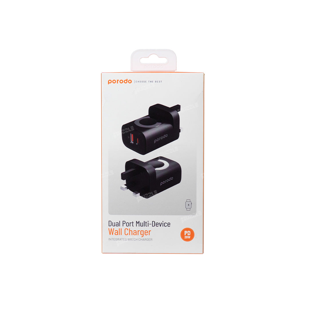 - شاحن حائط سريع بقدرة 20 واط وبمنفذي يو اس بي اي و يو اس بي سي من بورودو, مع شحن ساعة ابل - اسود | Porodo Wall Charger USB-A and USB-C Dual Port with Apple Watch Charger PD 20W – Black