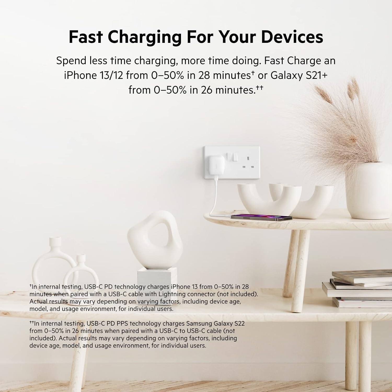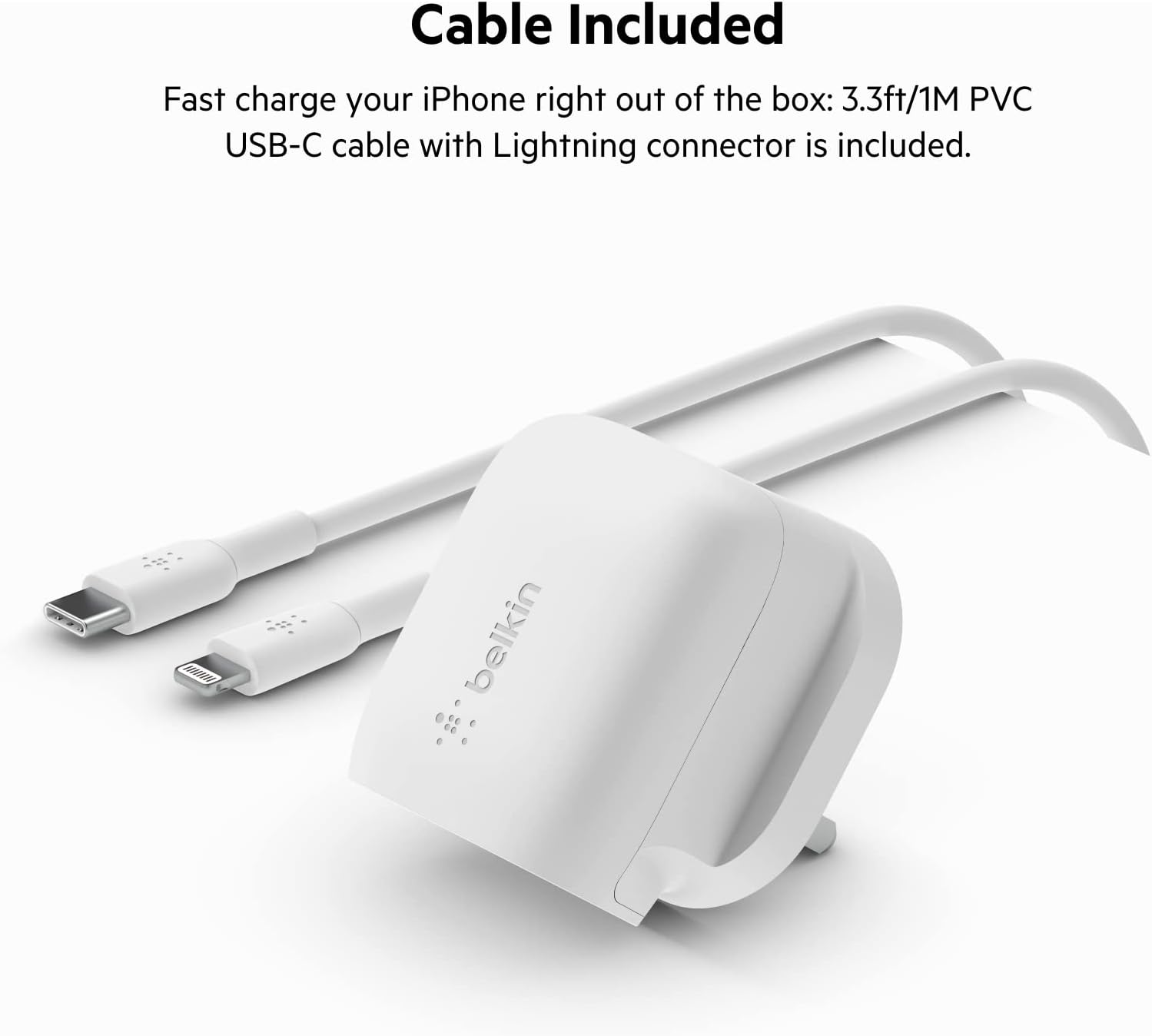 - Belkin BoostCharge USB-C Wall Charger 20W USB-C Cable with Lightning Connector - شاحن جداري يو اس بي سي بوست شارجر بقوة 20 واط مع كابل يو اس بي سي إلى موصل لايتننج من بيلكن