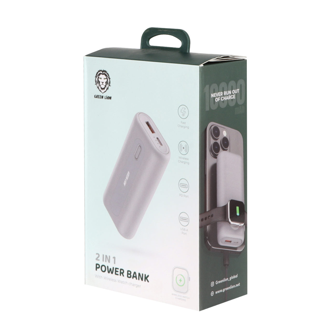 - باور بانك جرين لايون 2 في 1 بسعة 10,000 مللي امبير مع شحن لاسلكي للساعات الذكية بقدرة 2.5 واط - رمادي | Green Lion 2 in 1 Power Bank 10000mAh with Wireless Watch Charger 2.5W - Gray