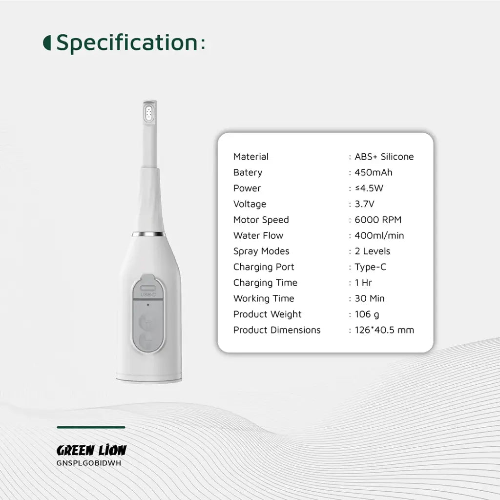 يعمل الجهاز بواسطة بطارية 450mAh تمنحه 30 دقيقة من الاستخدام المستمر بعد شحن سريع ساعه واحدة عبر منفذ Type-C. يوفر تنظيفًا فعالًا بفضل سرعة المحرك 6000 دورة/دقيقة وتدفق المياه 400 مل/دقيقة.