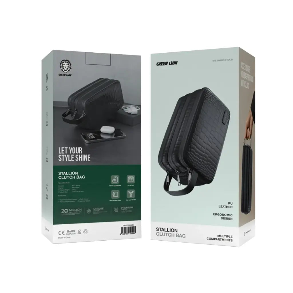 حقيبة Green Lion Stallion Clutch Bag تجمع بين الأناقة العملية والمتانة العالية لتكون الخيار المثالي للاستخدام اليومي أو أثناء السفر. صنعت من طبقة خارجية من جلد PU الفاخر بملمس أنيق ومقاوم للاستخدام الطويل، مع بطانة داخلية من الألياف الدقيقة (Microfiber) لحماية محتوياتك من الخدوش. تصميمها المريح والمزود بمقبض قوي يجعل حملها سهلًا ومناسبًا لمختلف المناسبات.