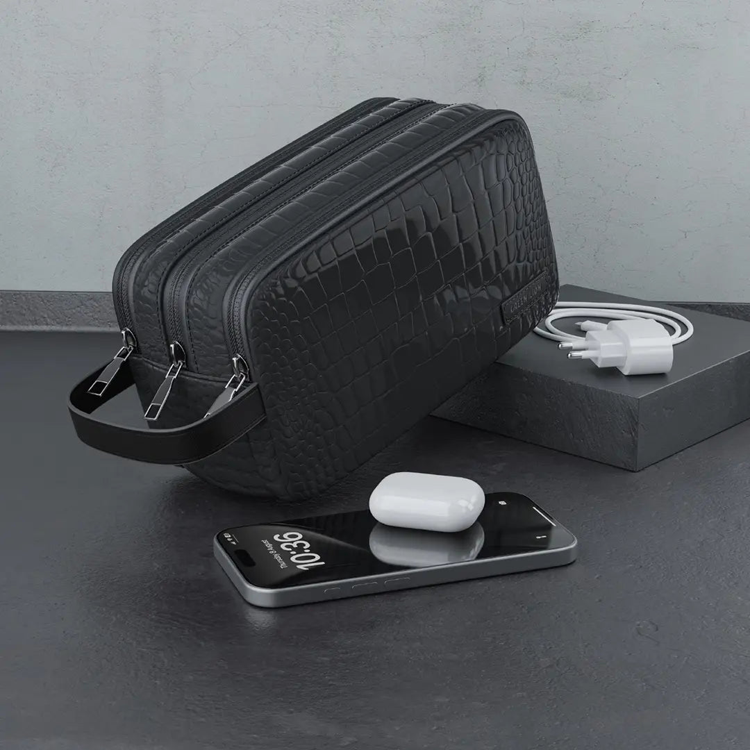 كما تحتوي الحقيبة على جيوب شبكية داخلية لتنظيم الإكسسوارات مثل الأجهزة الصغيرة، الشواحن، مستحضرات التجميل أو المتعلقات الشخصية. بفضل السحاب المصنوع من سبائك الزنك توفر الحقيبة إغلاقًا آمنًا ومتينًا، بالإضافة إلى مقاومتها للماء لحماية أغراضك من الانسكابات أو الرطوبة الخفيفة. مزيج من التصميم العصري والوظائف المتعددة يجعل هذه الحقيبة رفيقًا مثاليًا للذوق الراقي والتنظيم العملي.