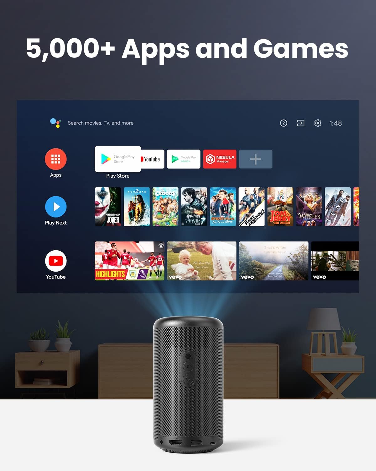 - Android TV 9.0: أطلق العنان لعالم من إمكانيات الترفيه مع Android TV. قم بتخصيص جهاز العرض الصغير Capsule II الخاص بك مع أكثر من 3600 تطبيق، بما في ذلك YouTube وHulu وTwitch والمزيد.