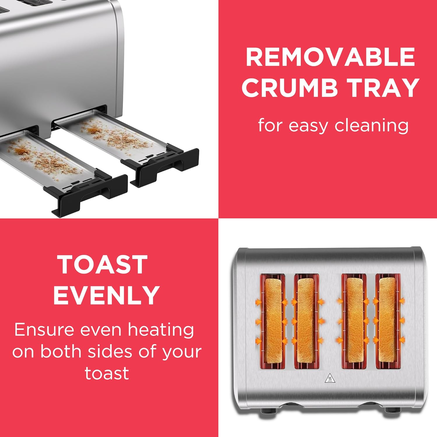 محماصة خبز بلاك آند ديكر 4 شرائح 2100 وات مع تسخين مزدوج، 6 إعدادات تحميص، صينية فتات قابلة للإزالة وتصميم ستيل أنيق للسهولة والنظافة.