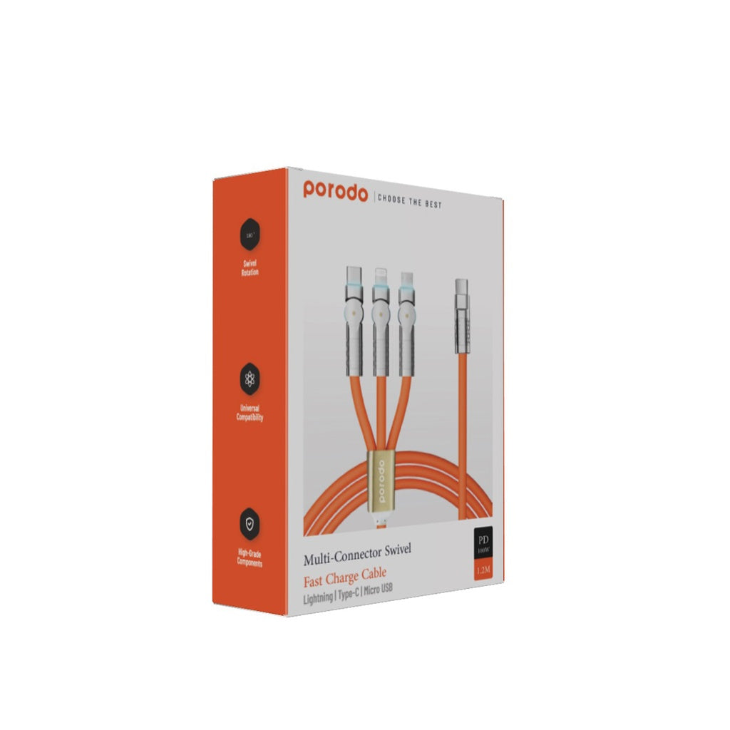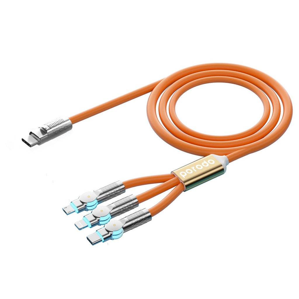 - بورودو كيبل ثلاثي المنافذ بشحن سريع 100 واط مع دوران 180 درجة, بطول 1.2 متر - برتقالي | Porodo PD100W Three-in-one Cable 180 Degrees Rotation: 1.2M - Orange