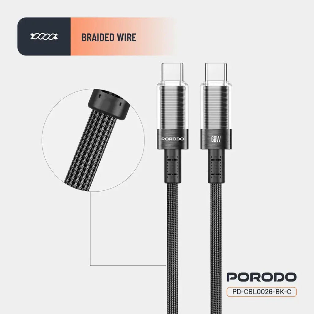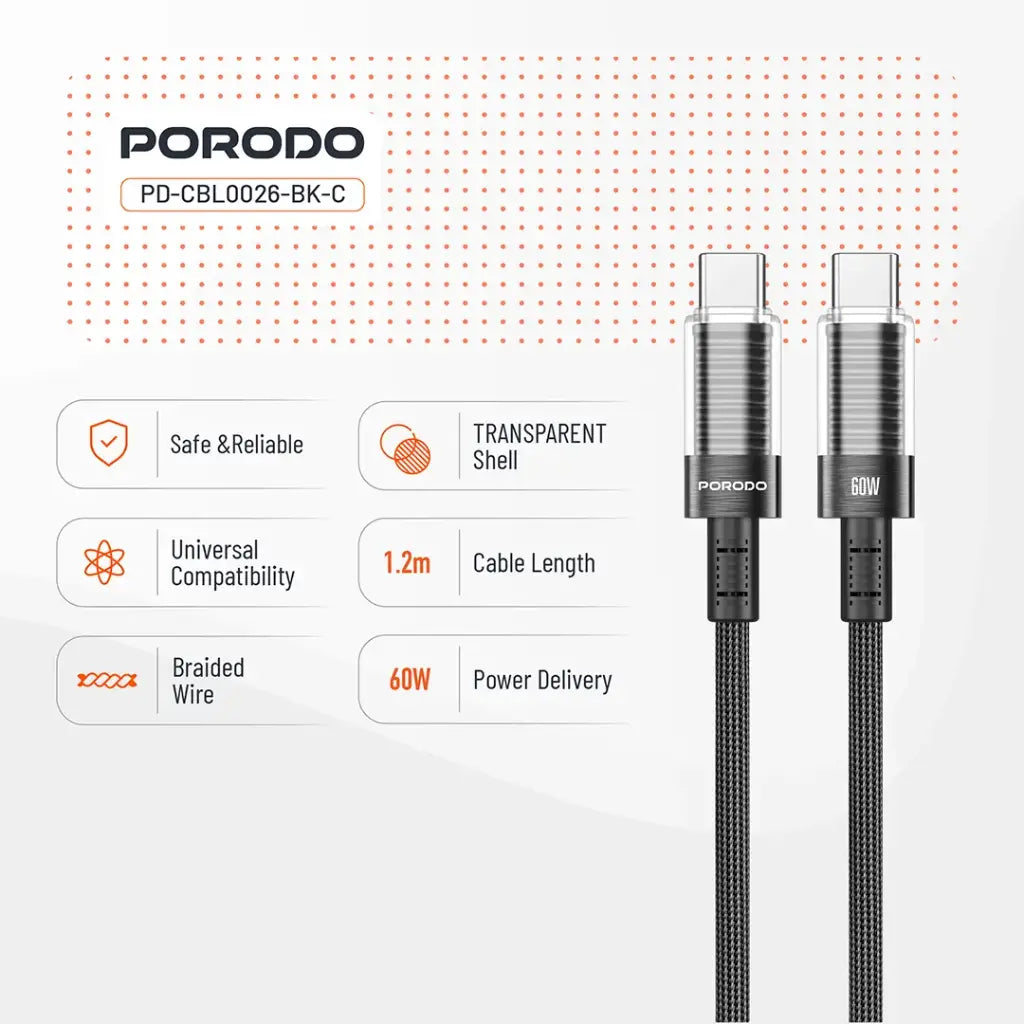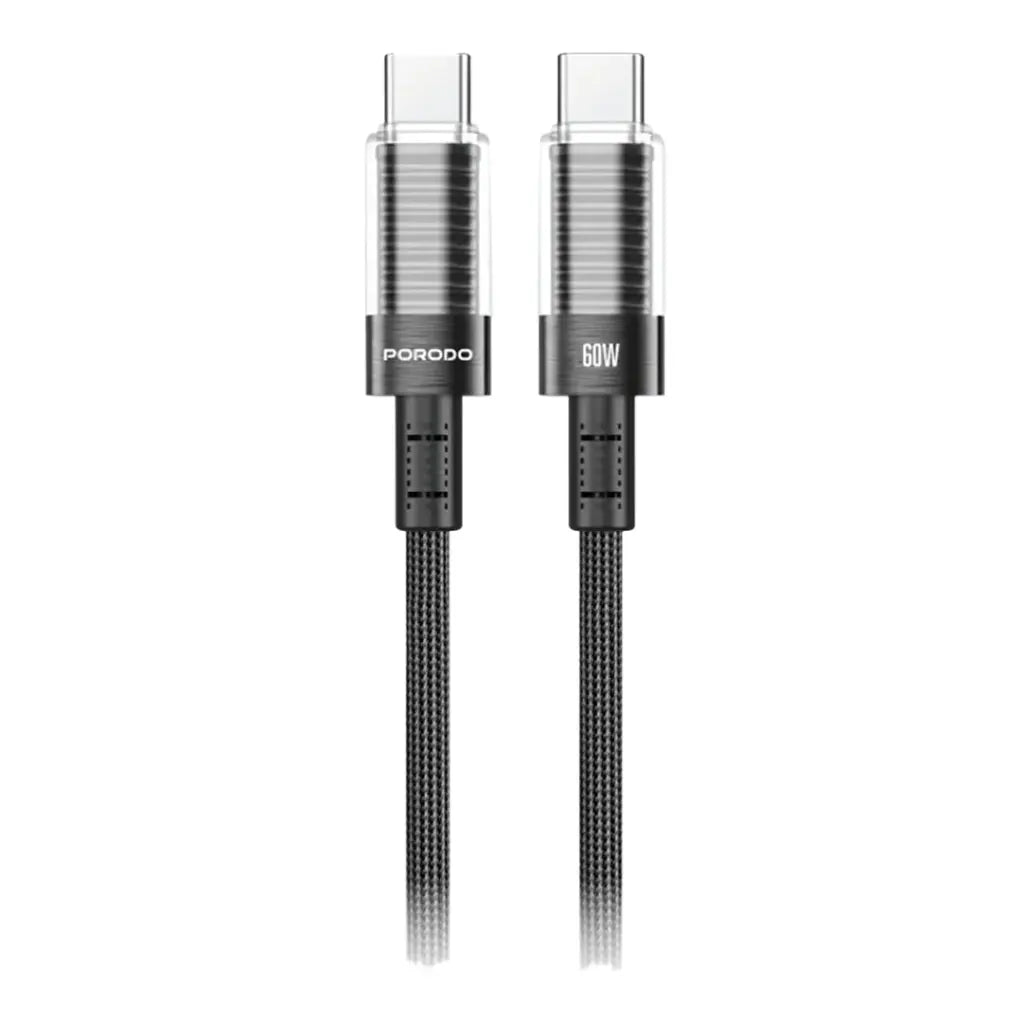 - كيبل بورودو المضفر برأس شفاف من يو اس بي سي الى يو اس بي سي بطول 1.2 متر, شحن سريع بقدرة 60 واط - اسود | Porodo Braided 60W PD C to C Fast Charging Cable with Transparent Head 1.2M - Black.