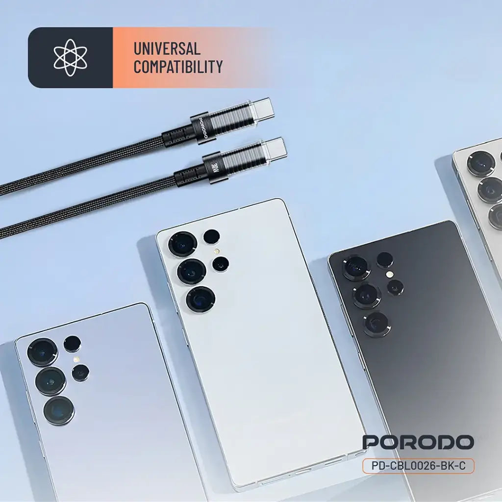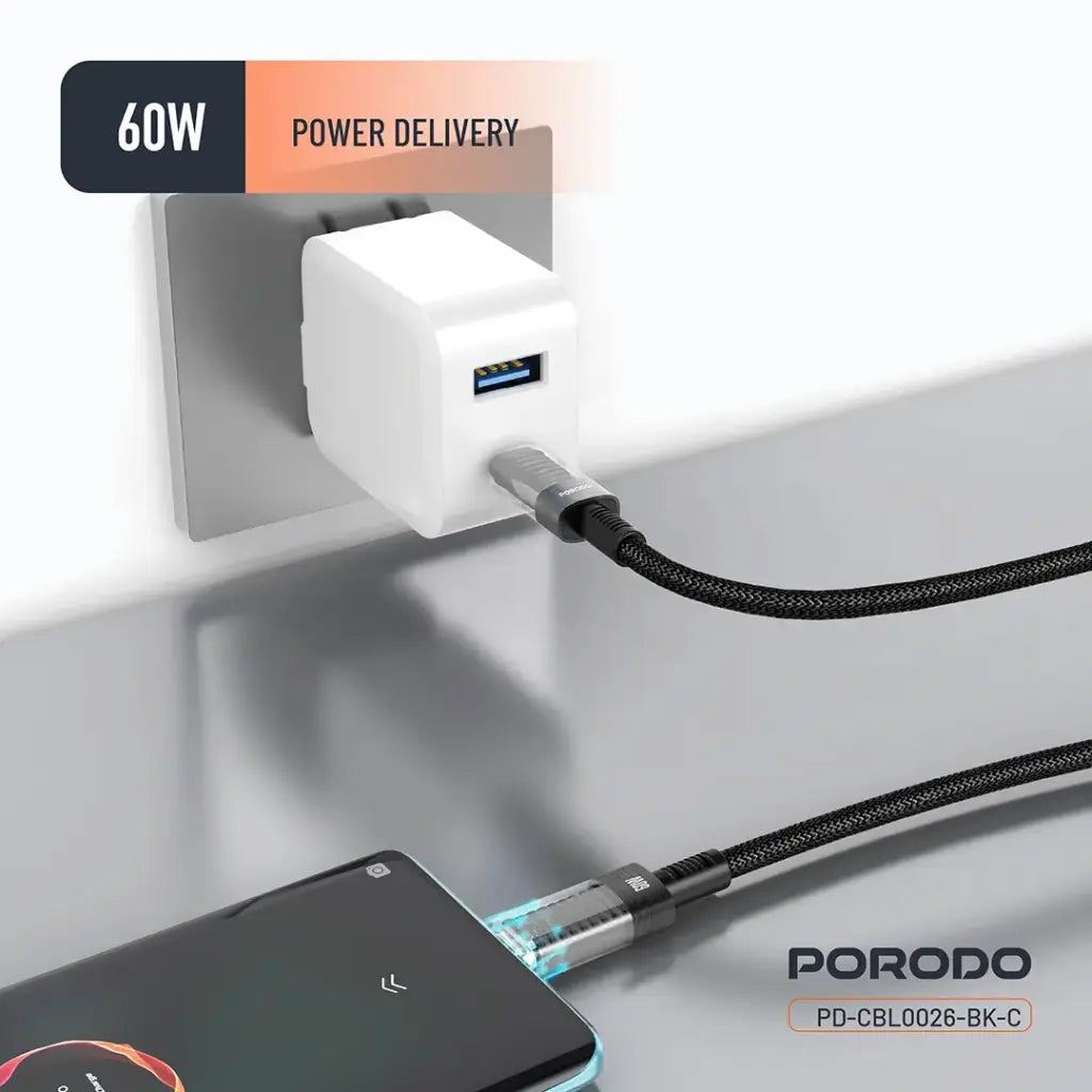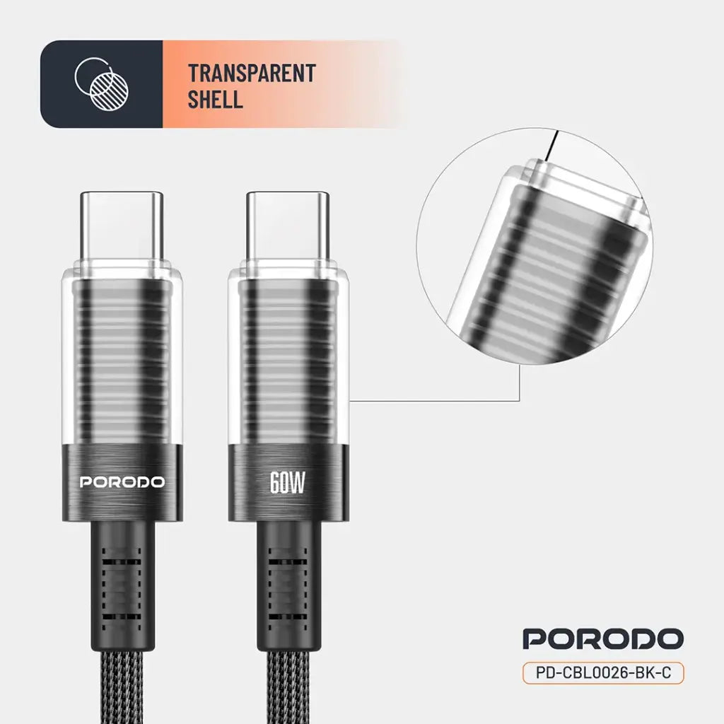 - كيبل بورودو المضفر برأس شفاف من يو اس بي سي الى يو اس بي سي بطول 1.2 متر, شحن سريع بقدرة 60 واط - اسود | Porodo Braided 60W PD C to C Fast Charging Cable with Transparent Head 1.2M - Black.