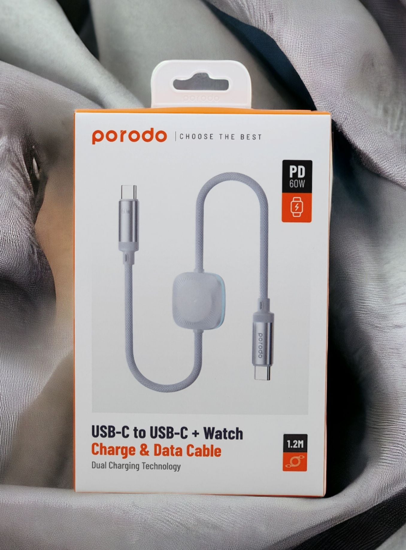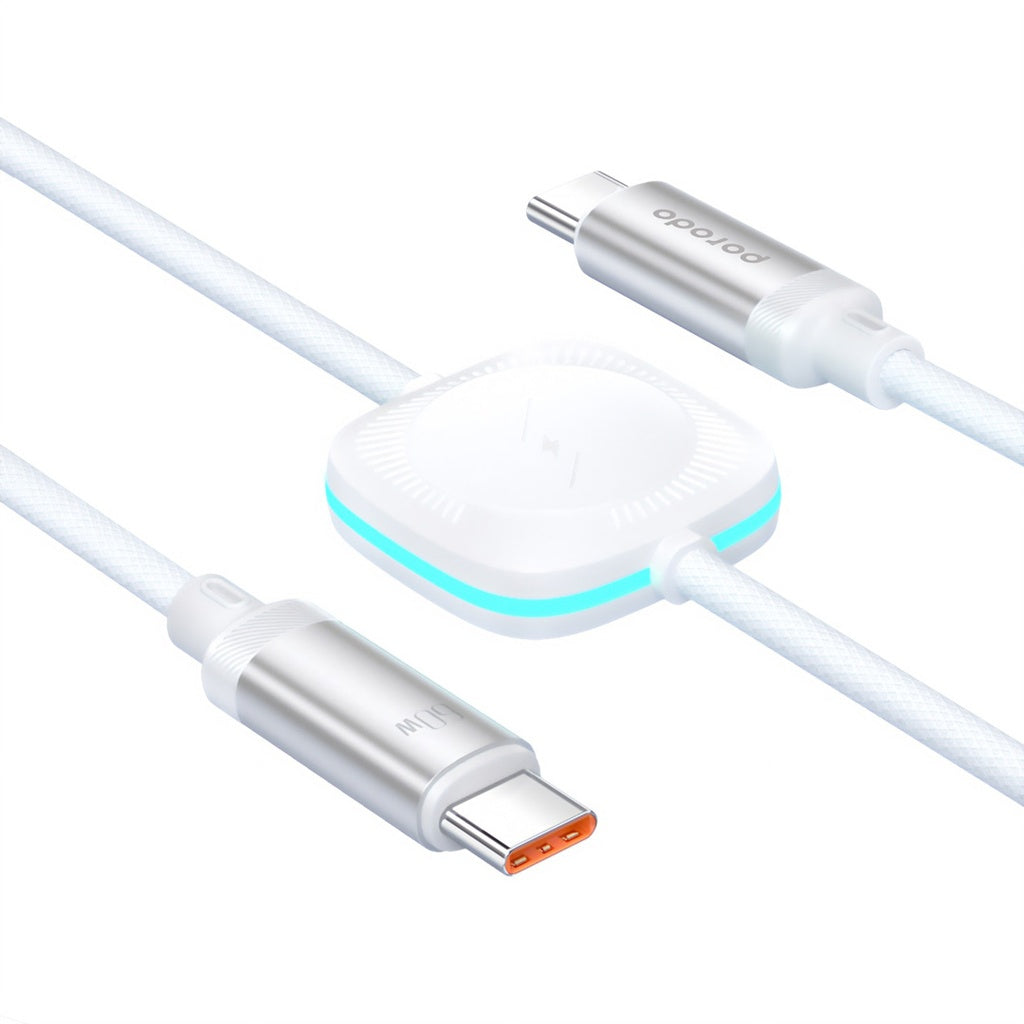 - كيبل بورودو 2 في 1 يو اس بي سي الى يو اس بي سي بطول 1.2 متر مع شاحن ساعة لاسلكي 60 واط - ابيض | Porodo 2in1 USB-C to USB-C 60W Cable with Wireless Watch Charger 1.2M – White