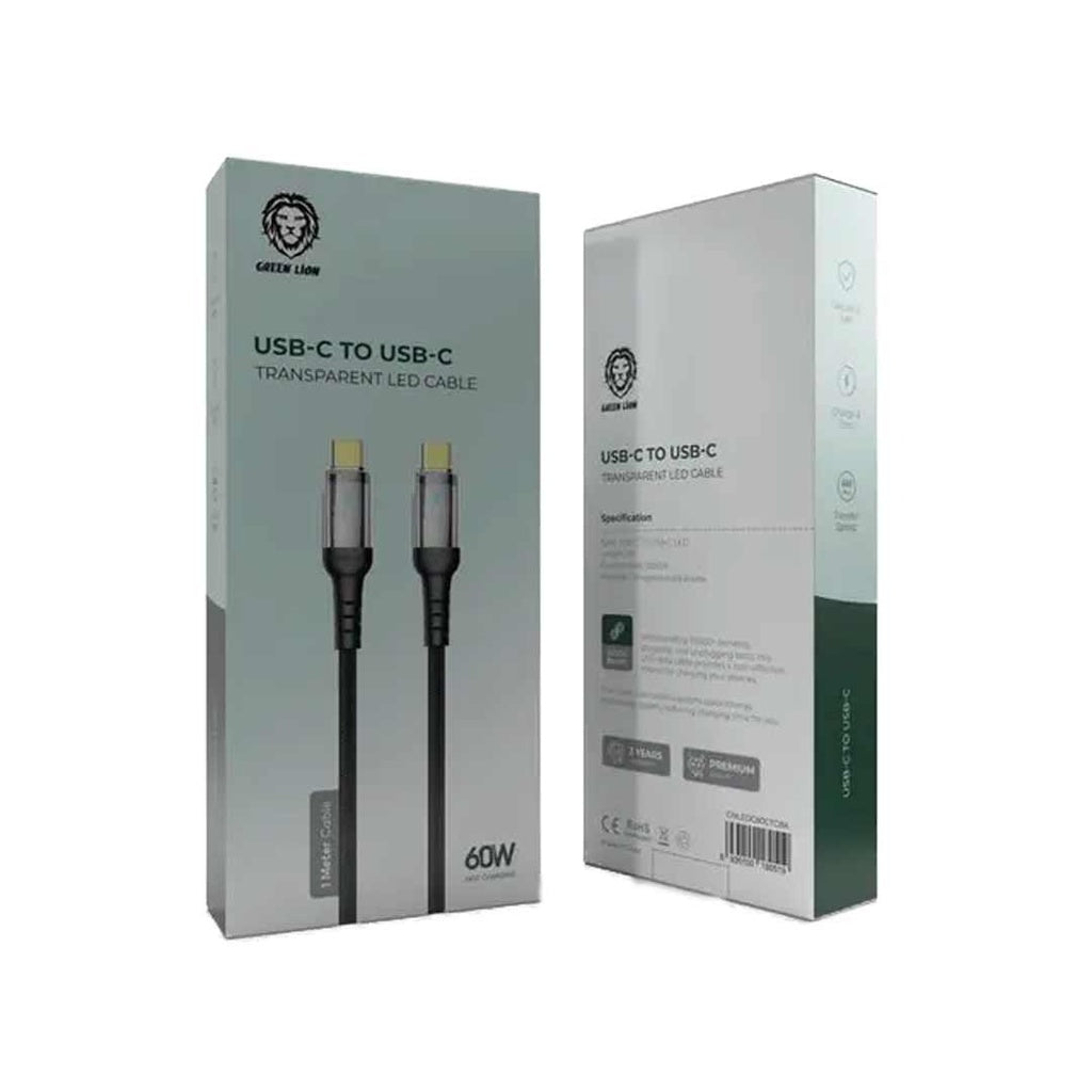 - كيبل جرين لايون شفاف يو اس بي سي الى يو اس بي سي بقدرة شحن 60 واط واضائة LED, بطول 1 متر - اسود | Green Lion Transparent LED Cable 60W C to C - Black