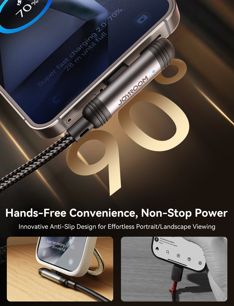 كيبل Joyroom EnjoyX Series مصمم خصيصًا لتوفير شحن سريع وأداء متميز بفضل قدرته 60 واط وسرعة نقل بيانات تصل إلى 480Mbps. يتميز بتصميم 90° ميني بزاوية مريحة تمنحك سهولة الاستخدام خصوصًا أثناء اللعب أو مشاهدة الفيديوهات أثناء الشحن. الكيبل مصنوع من نايلون مضفر عالي الكثافة مع غلاف ألومنيوم لمتانة استثنائية وتحمل أكثر من 10000 عملية توصيل وفصل مع مقاومة للتآكل والشد. بفضل النواة النحاسية السميكة والتقنية الذكية لتنظيم الجهد والتيار، يضمن شحن آمن، سريع، وكفاءة عالية مع تقليل الحرارة.