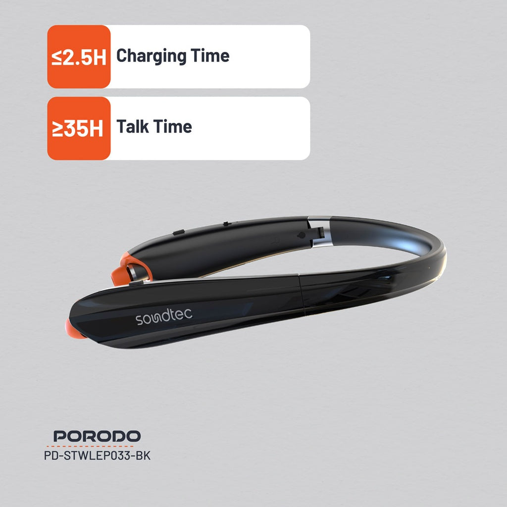 - بورودو ساوندتيك سماعة بلوتوث حول الرقبة مع سماعات قابلة للتمديد - اسود | Porodo Soundtec Bluetooth Neck Band with Extendable Earbuds - Black