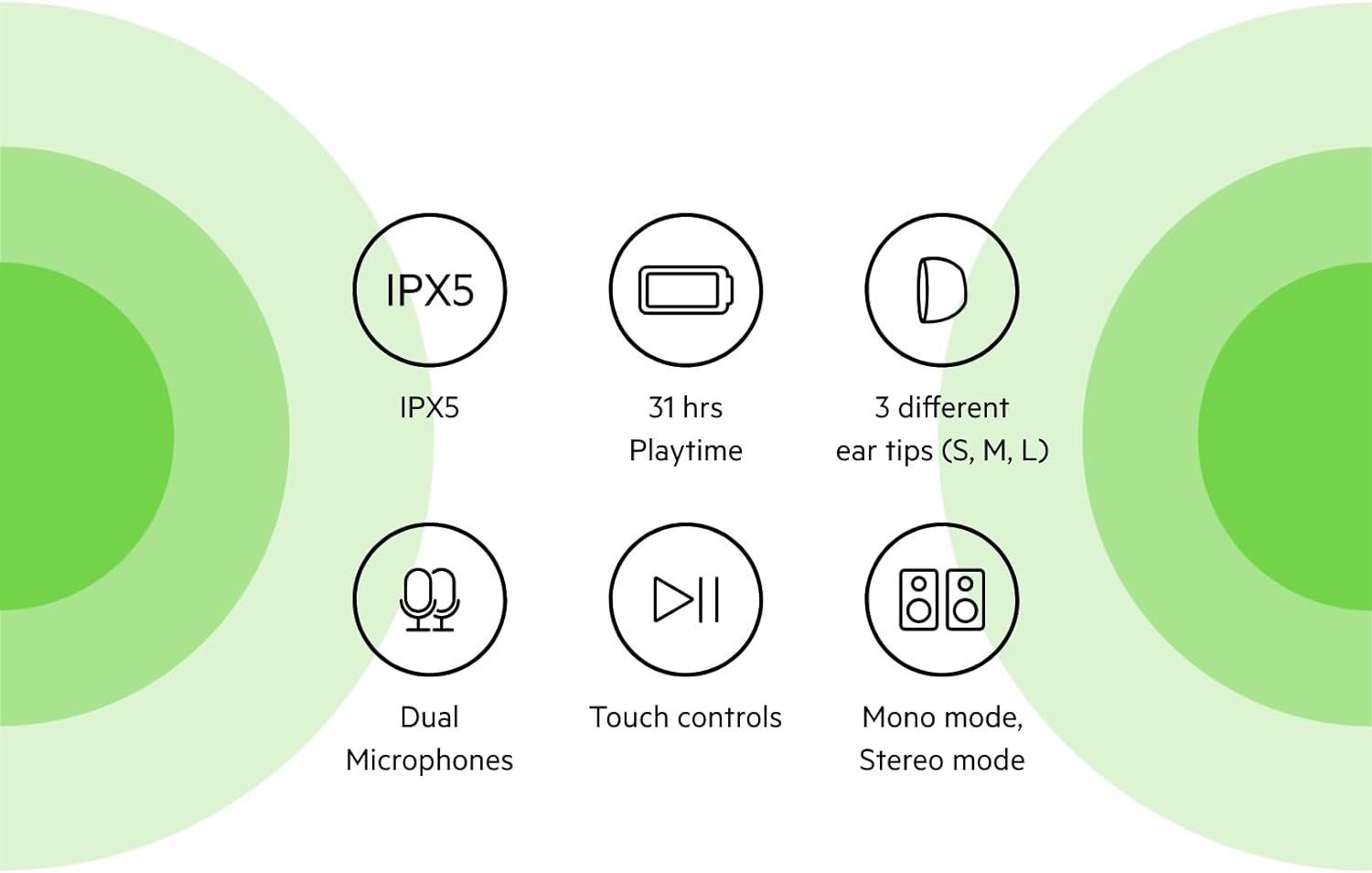 - تمنحك مقاومة العرق والماء بتصنيف IPX5 القدرة على الاستمرار بغض النظر عن الطقس. التدريبات الشاقة والأمطار غير المتوقعة لن تمنعك من الاستماع اليومي.