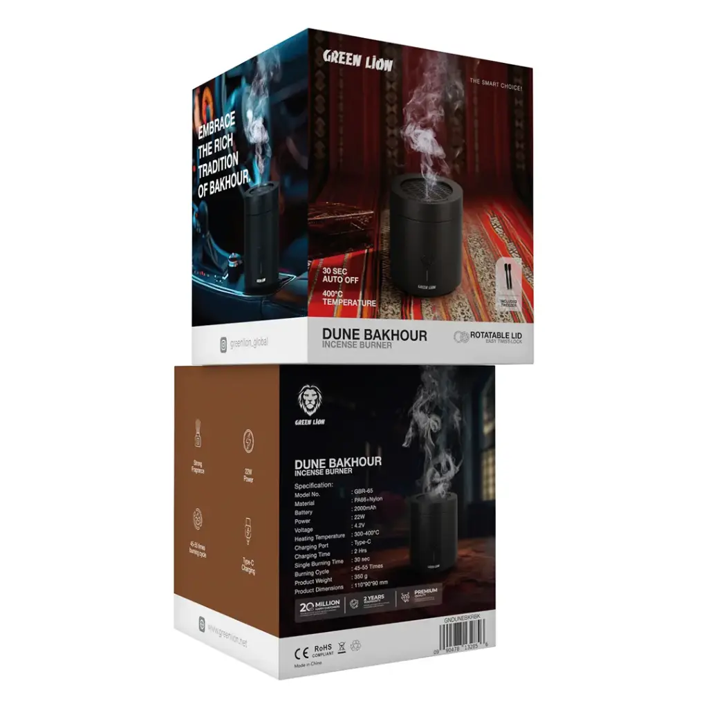 يجمع موقد البخور جرين ليون دون بين تقنيات العطر التقليدية والحداثة لتقديم تجربة سهلة وممتعة للاستمتاع برائحة بخور غنية وطويلة الأمد. مصنوع من PA66 + نايلون المتين، ويأتي مزودًا ببطارية 2000mAh ونظام تسخين بقوة 22 واط، مع درجات حرارة تتراوح بين 300-400°C لتفريق الرائحة بكفاءة عالية.
