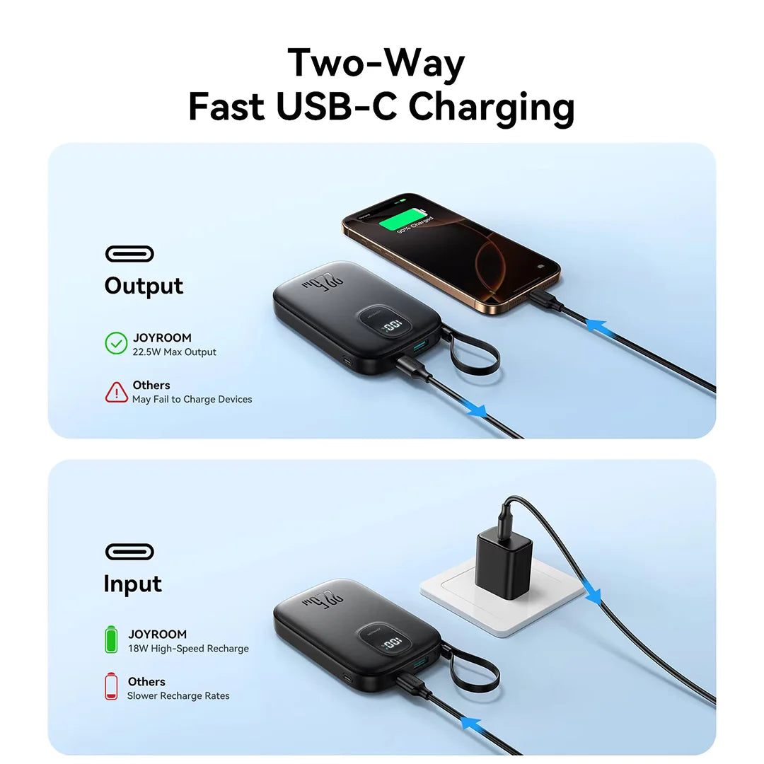 - باور بانك جويرووم بسعة 10,000 مللي امبير وقدرة شحن 22.5 واط مع كيبل تايب سي مدمج - اسود | JOYROOM JR-PBF17 22.5W Fast Charging Power Bank With Type-C Cable 10000mAh – Black
