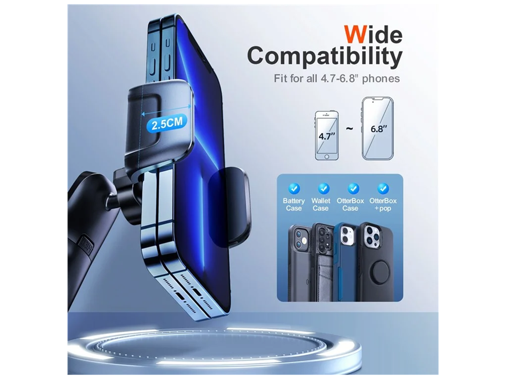 - أذرع تثبيت قابلة للتعديل تلقائيًا لتناسب الهواتف من 4.5–6.7 إنش.