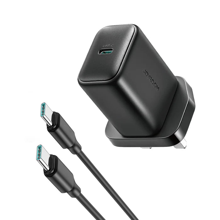 - شاحن جداري جويرووم JR-TCF23 بقدرة شحن 25 واط مع كيبل تايب سي الى تايب سي مدمج بطول 1 متر - اسود | JOYROOM JR-TCF23 25W PD Charger with 1m C to C Cable – Black