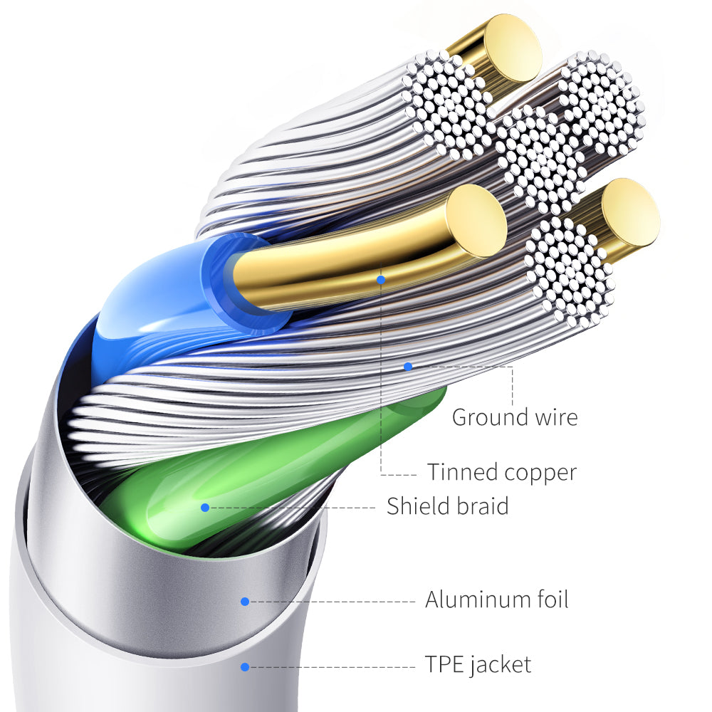 استخدم النوى النحاسية المعلبة السميكة 30/18AWG، مما يعزز استقرار النقل، وشحن أسرع وأكثر أمانًا -