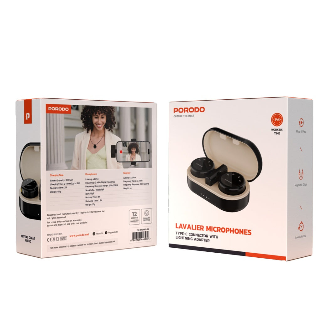 - بورودو مايكروفون لاسلكي ثنائي مع علبة شحن - اسود | Porodo Wireless Microphone Dual Mic with Charging Case - Black