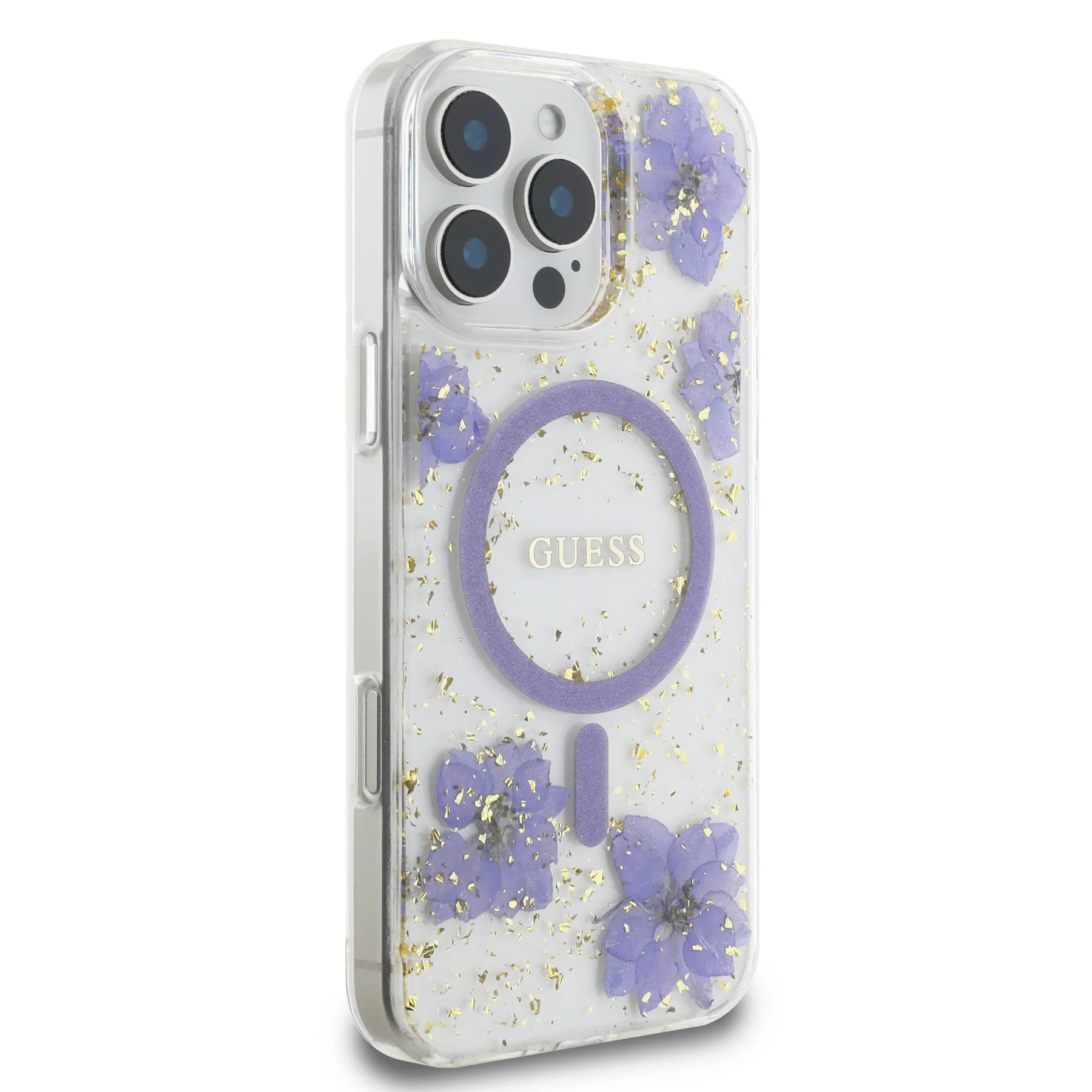 - GUESS MagSafe Hard Case with Resin Flowers Design for iPhone 16 Pro | كفر GUESS صلب مزين بزهور الريزن. متوافق مع ماج سيف لهاتف ايفون 16 برو