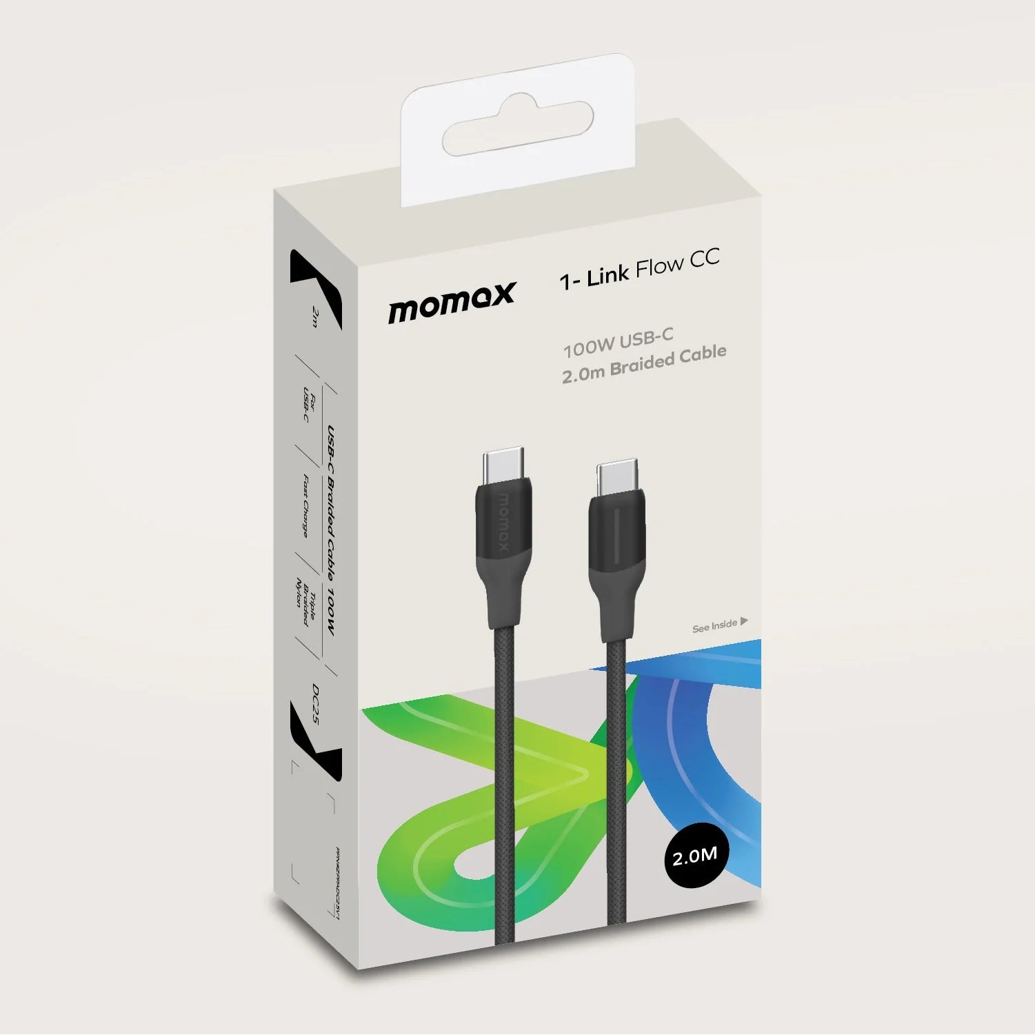 - Momax 1‑Link Flow CC 100W USB‑C to USB‑C Braided Cable, 2 m - كيبل موماكس 1-لنك فلو, USB-C الى USB-C, نايلون مضفر, بقدرة 100 واط, طول 2م