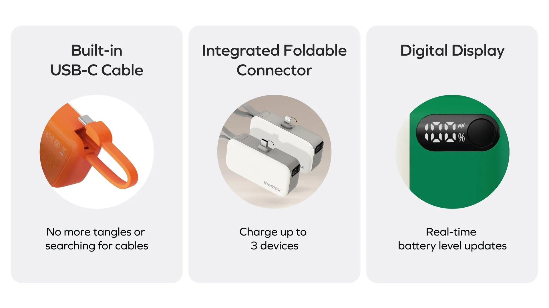 استمتع بالشحن الفوري بدون الحاجة لأسلاك إضافية مع مومكس 1-Power Mini، باور بانك صغير الحجم بسعة 5000mAh مزوّد بوصلة USB-C قابلة للطي ومُدمجة داخل الجهاز.