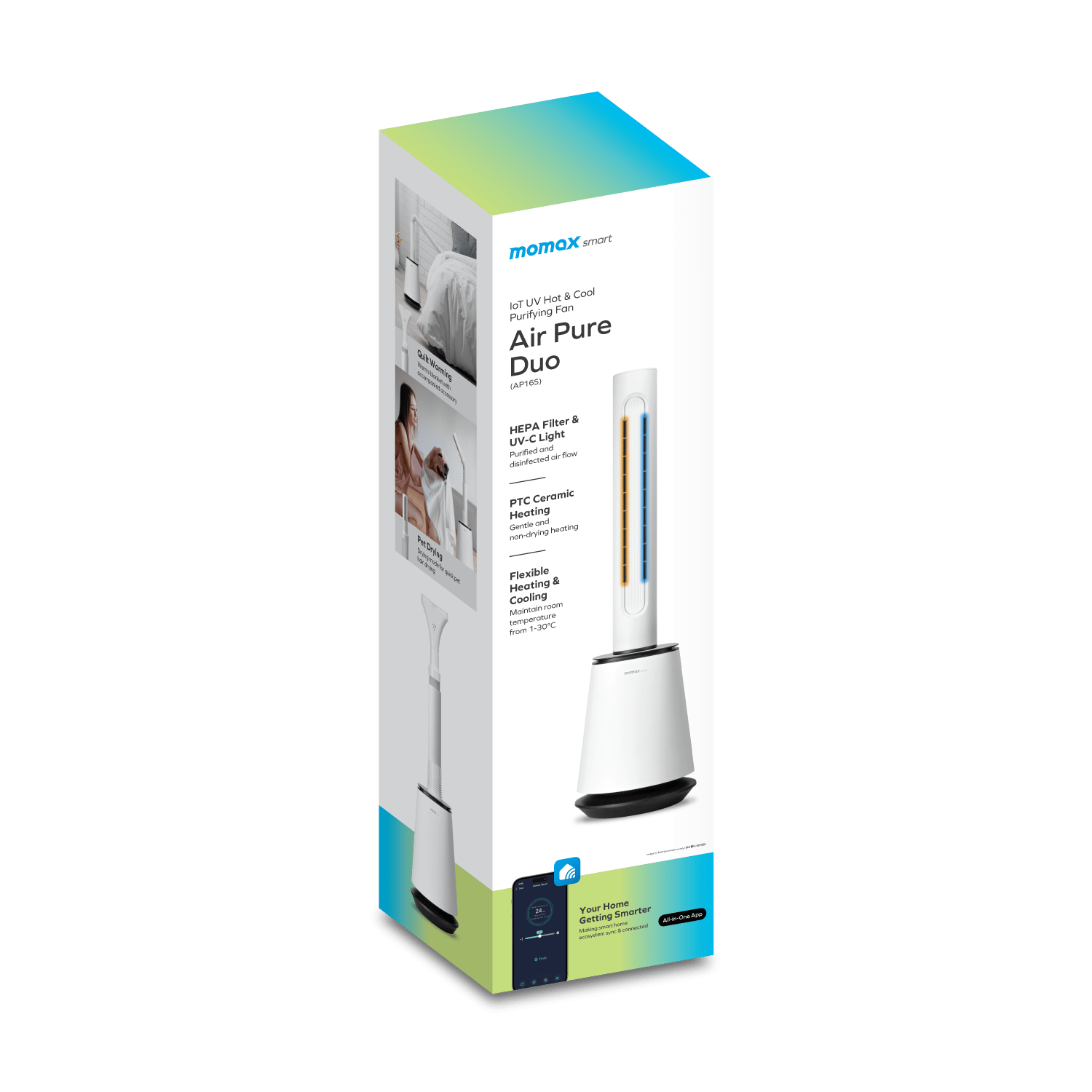 - Momax Air Pure Duo IoT UV Hot & Cool Purifying Fan - مروحة تنقية الهواء موماكس اير بيور ديو, بتقنية UV, تبريد وتدفئة ذكية, تنقية هواء