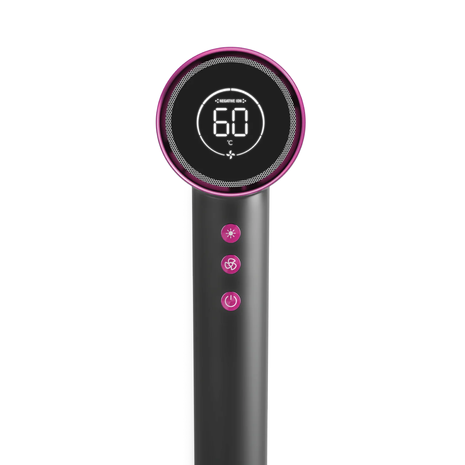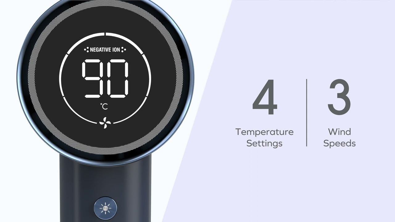 يحتوي المجفف على شاشة LCD تعرض بوضوح إعدادات الحرارة والسرعة، مع 4 إعدادات حرارة (رياح طبيعية، حرارة منخفضة 50°C، حرارة متوسطة 70°C، حرارة عالية 90°C) و3 سرعات للهواء، مما يوفر 12 وضعية تجفيف مختلفة لتناسب جميع أنواع الشعر والاحتياجات.