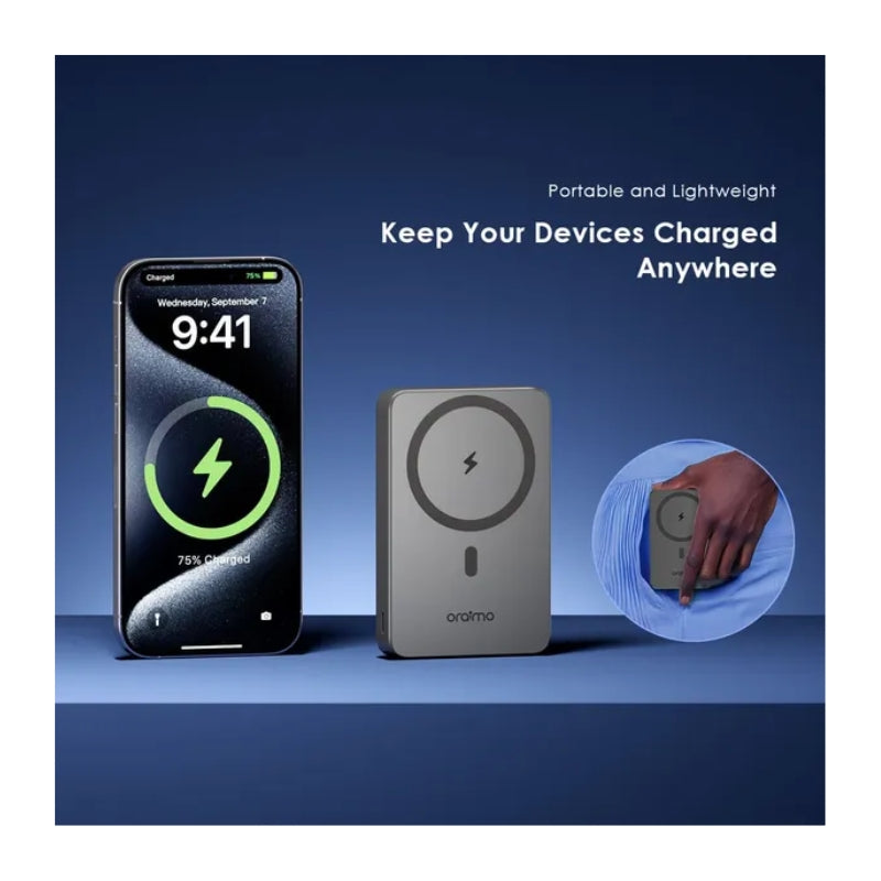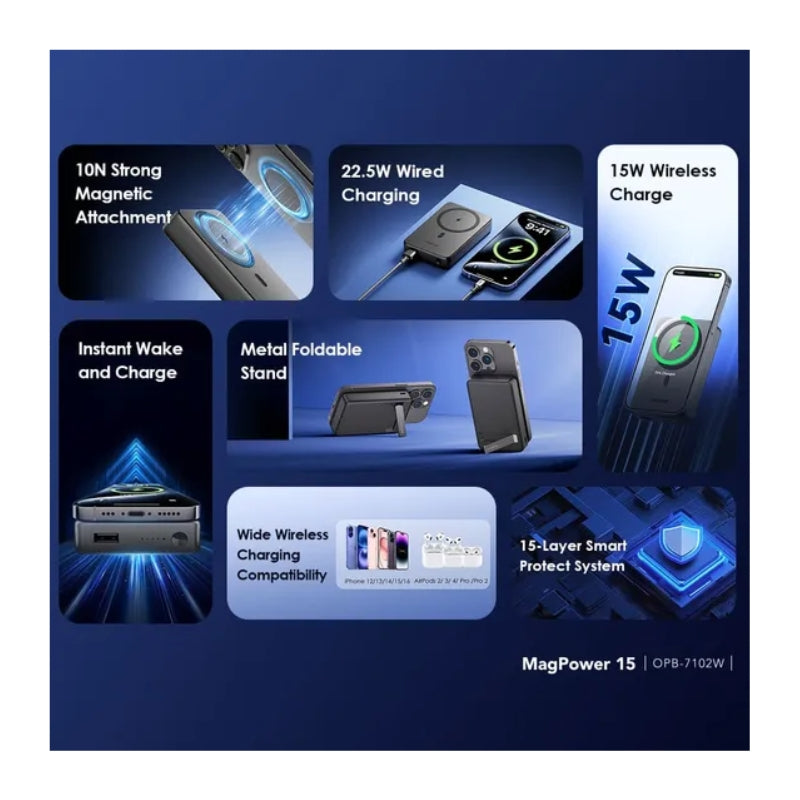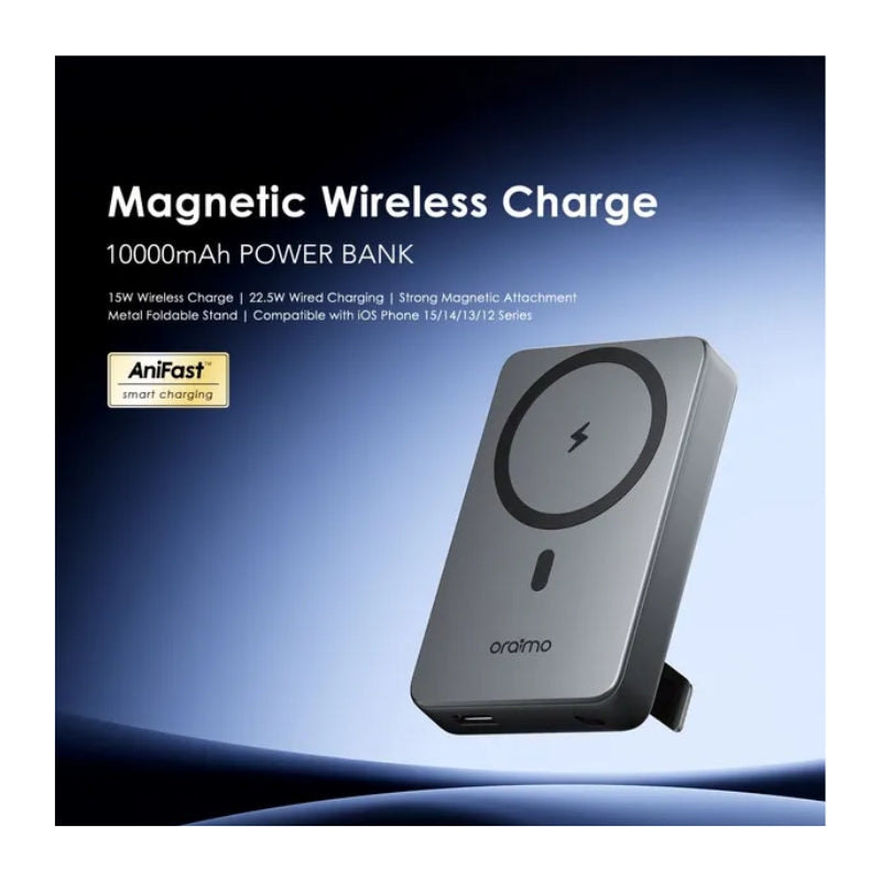 باور بانك أوريمو 10000mAh ذهبي مع شحن سريع 22.5 واط ولاسلكي مغناطيسي 15 واط، تصميم عملي مع حامل مدمج لتجربة شحن سهلة أثناء التنقل