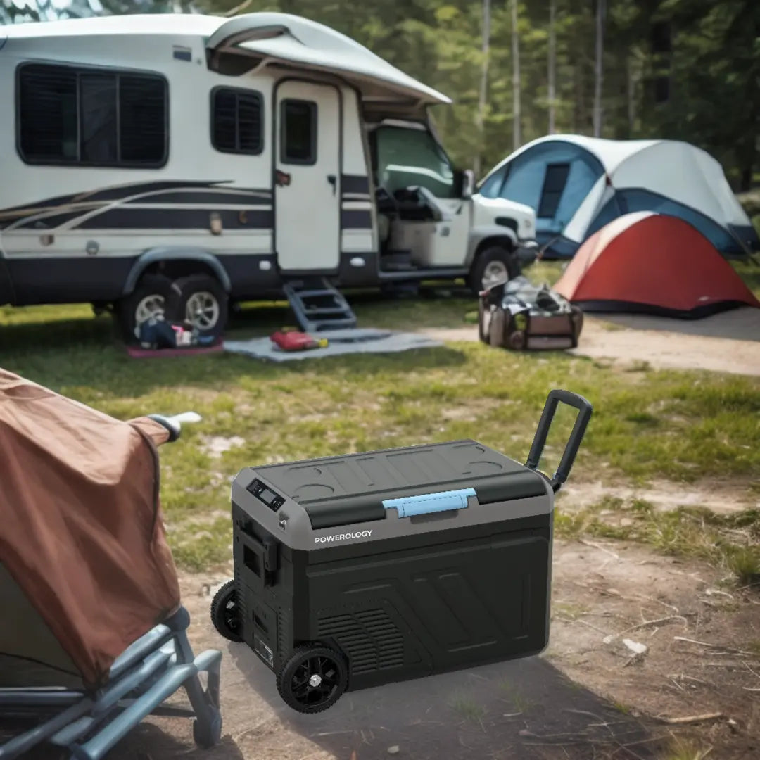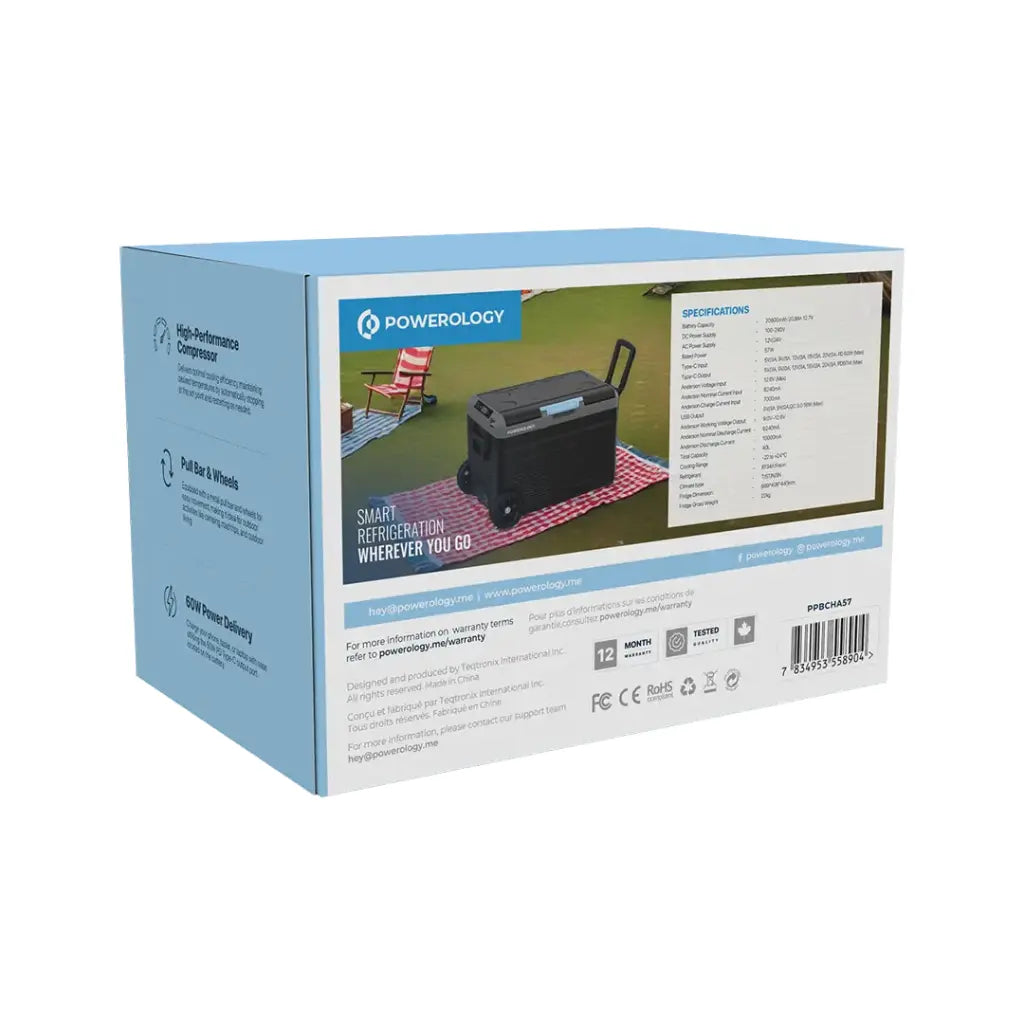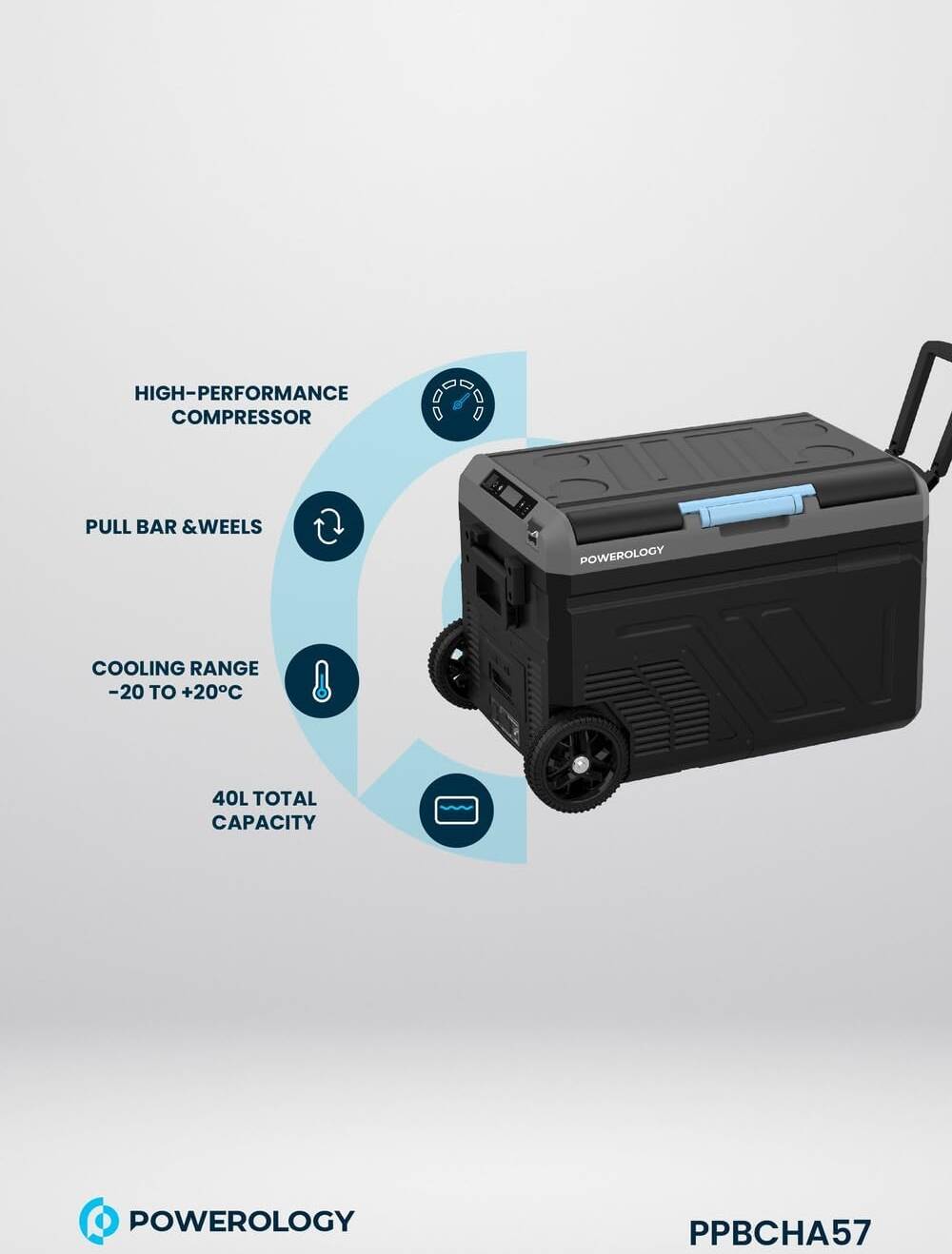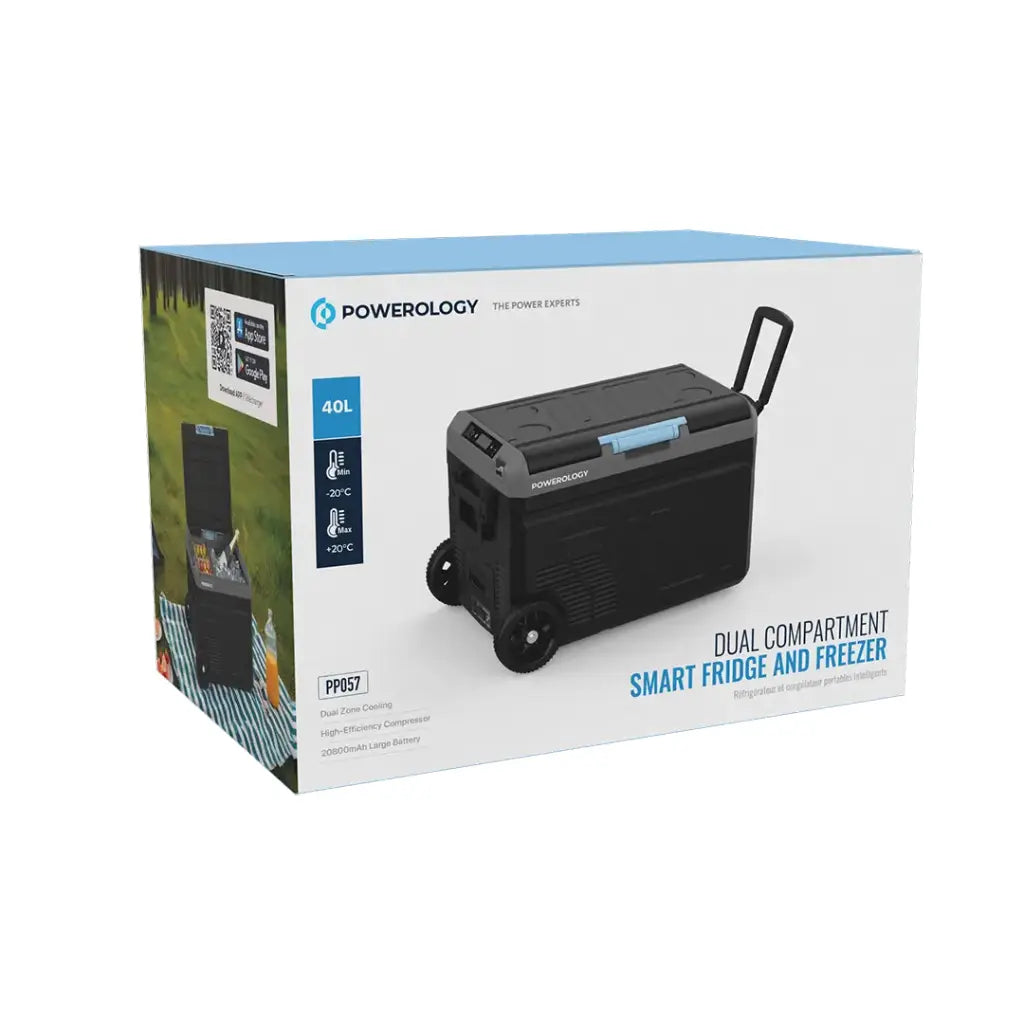 - ثلاجة محمولة بسعة 40 لتر وبطارية 20800 مللي امبير من باورولوجي, مع حجرة مزدوجة وعجلات - رمادي | Powerology Portable Fridge 40L with Dual Compartment & Trolley Wheels – Gray