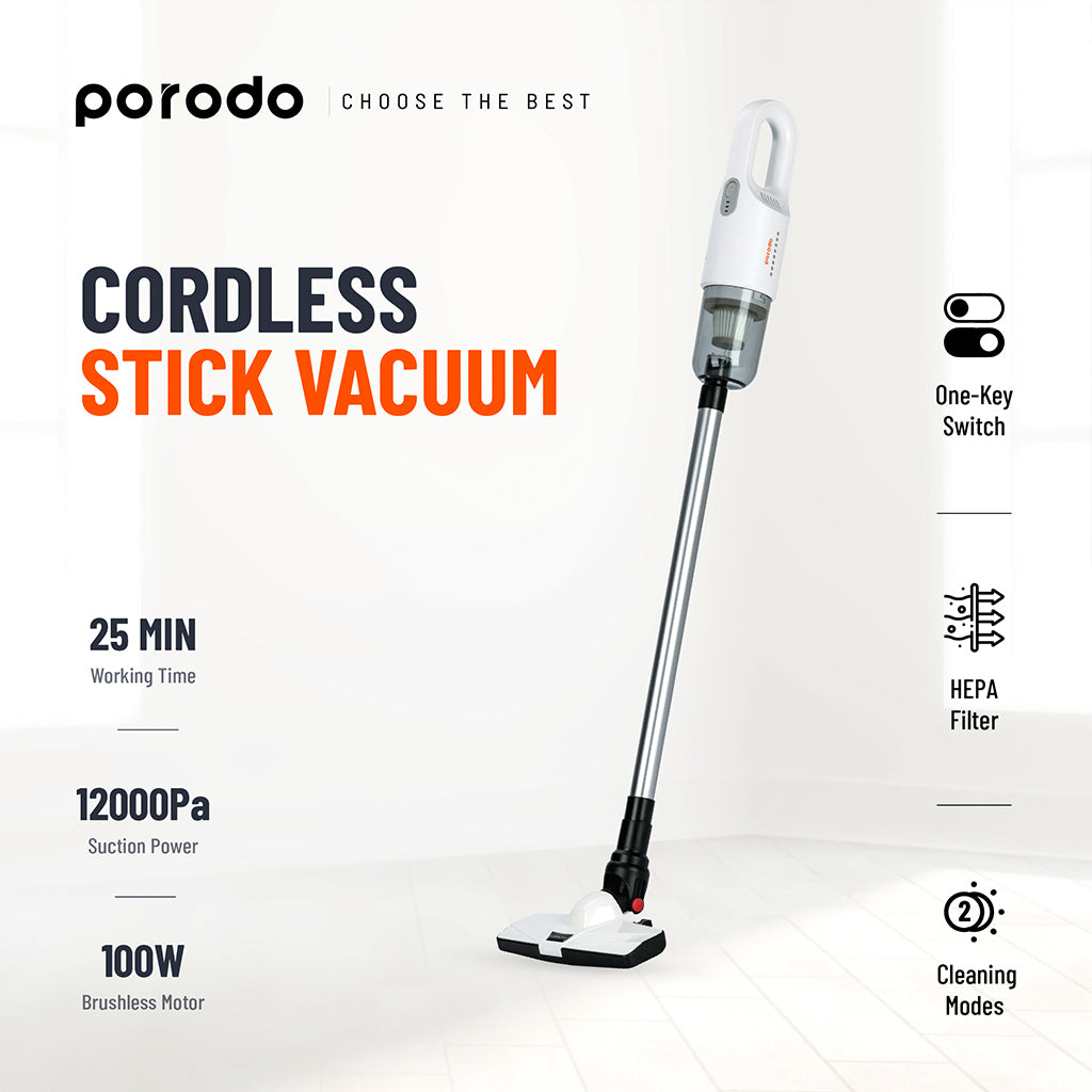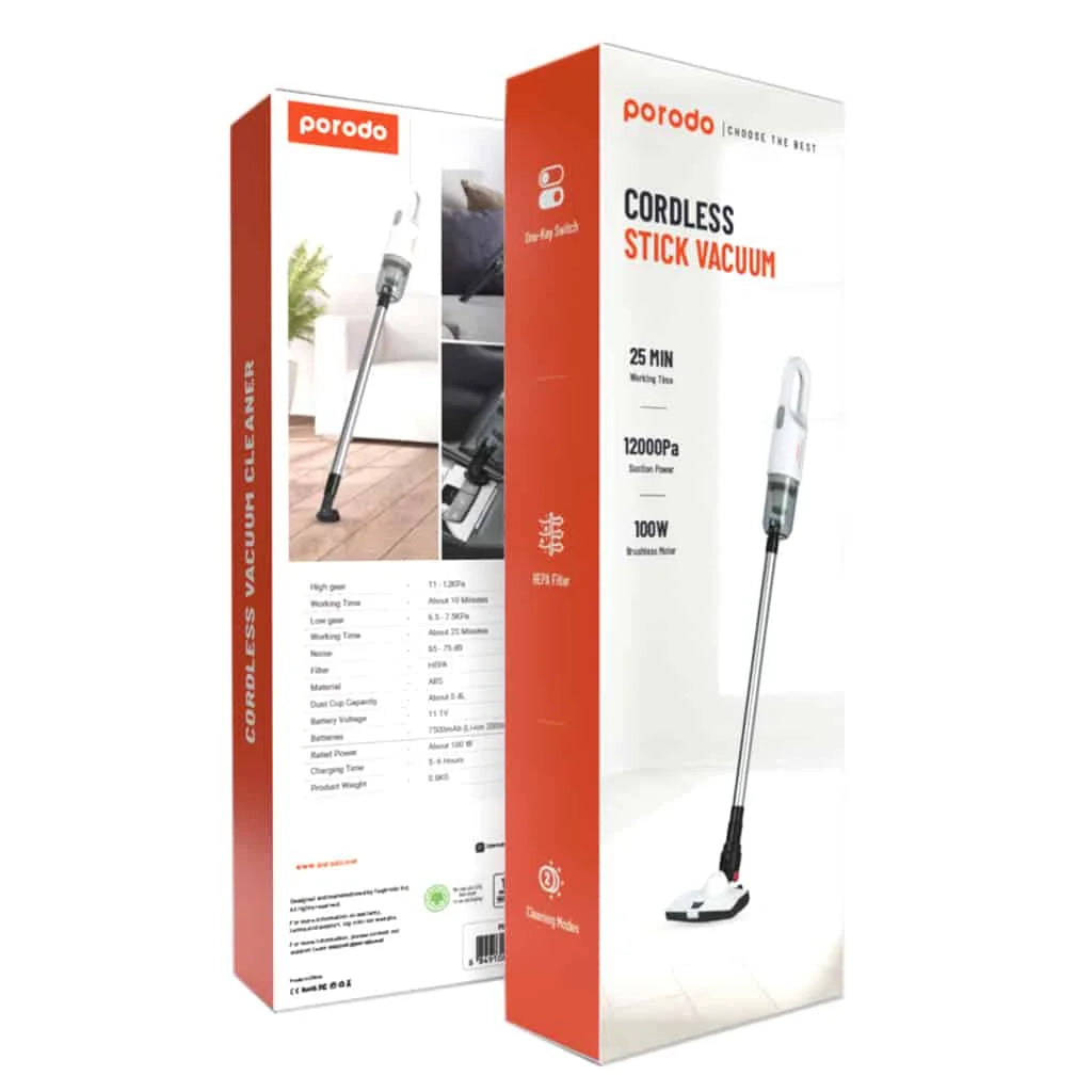- مكنسة كهربائية محمولة لاسلكية بقدرة 100 واط من بورودو, بطارية بسعة 7800 مللي امبير - ابيض | Porodo Portable Cordless Stick Vacuum Cleaner 11-12Kpa 100W 7800mAh - White