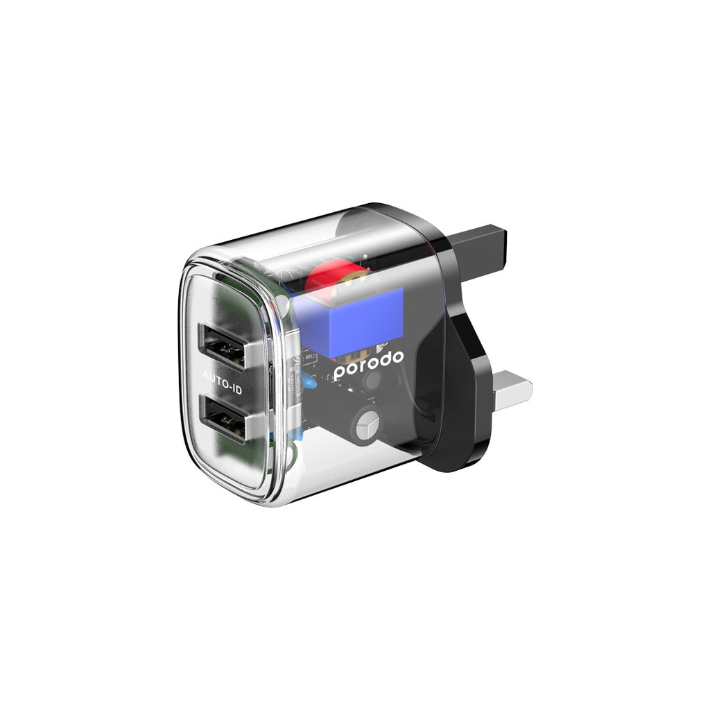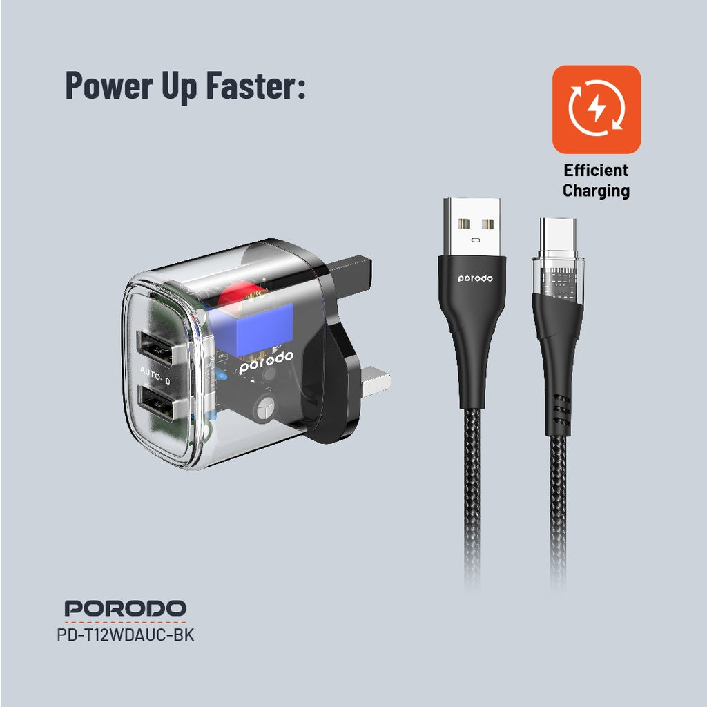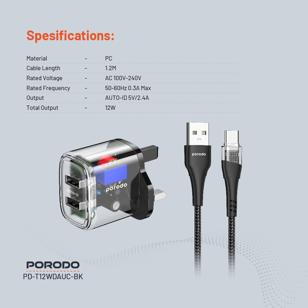 شاحن بورودو شفاف ثنائي المنفذ بقدرة 12 واط مع كيبل يو اس بي اي الى تايب سي بطول 1.2 متر | Porodo Dual Output Transparent Charger 2.4A 12W with 1.2M USB-A to Type-C Cable
