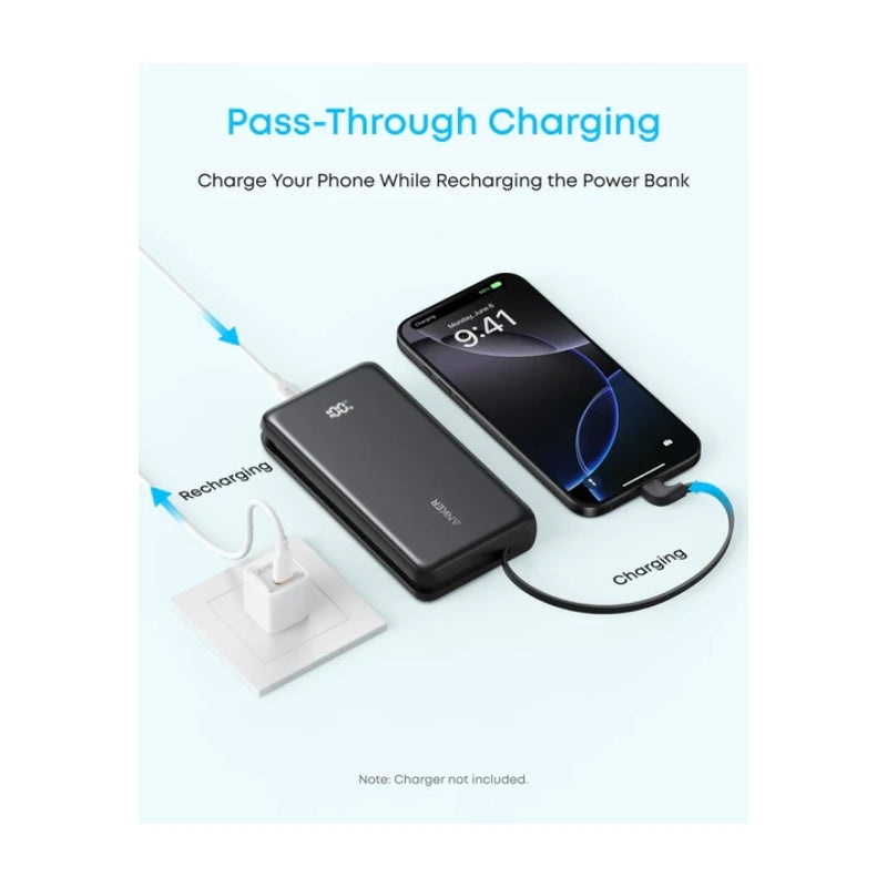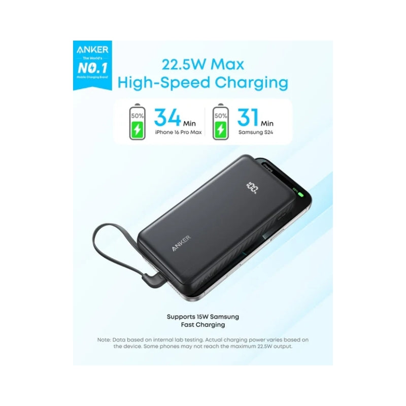 يدعم شحنًا سريعًا بقدرة 22.5 واط عبر كيبل USB-C مدمج ثنائي الاتجاه، ما يتيح شحن أجهزتك بكفاءة عالية—حتى 4 شحنات كاملة لمعظم الهواتف. كما يدعم Pass-Through Charging لتشغيل أجهزتك أثناء إعادة شحن الباور بنك نفسه، بالإضافة إلى وضع الشحن البطيء (Trickle Charging) للأجهزة منخفضة الاستهلاك مثل السماعات والساعات الذكية.