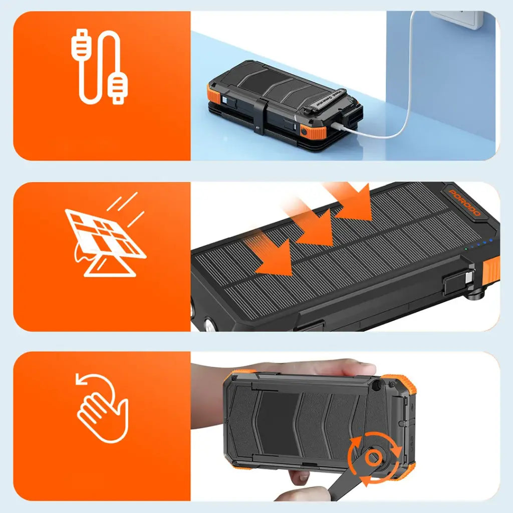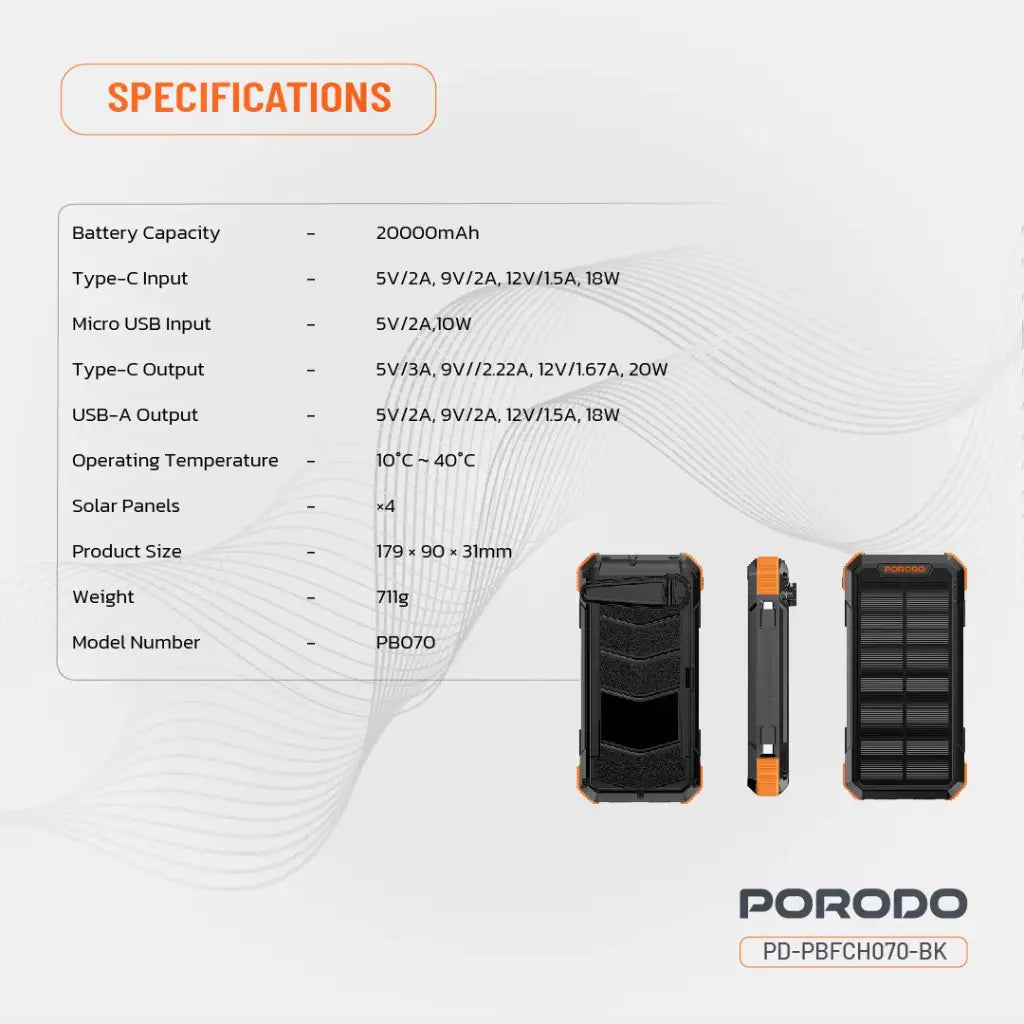 - استمتع بحرية الطاقة أينما كنت مع بورودو باور بانك الشمسي بسعة 20000mAh، المصمم خصيصًا لعشاق المغامرات والاستخدام في الظروف الطارئة. بفضل ألواحه الشمسية الأربعة (3 منها قابلة للفصل)، يمكنك إعادة شحنه باستخدام ضوء الشمس بسهولة أثناء التنقل. كما يدعم تقنيات الشحن السريع PD بقدرة 20W عبر منافذ Type-C وUSB-A، مع منافذ متعددة لإمكانية توصيل مختلف الأجهزة في نفس الوقت.