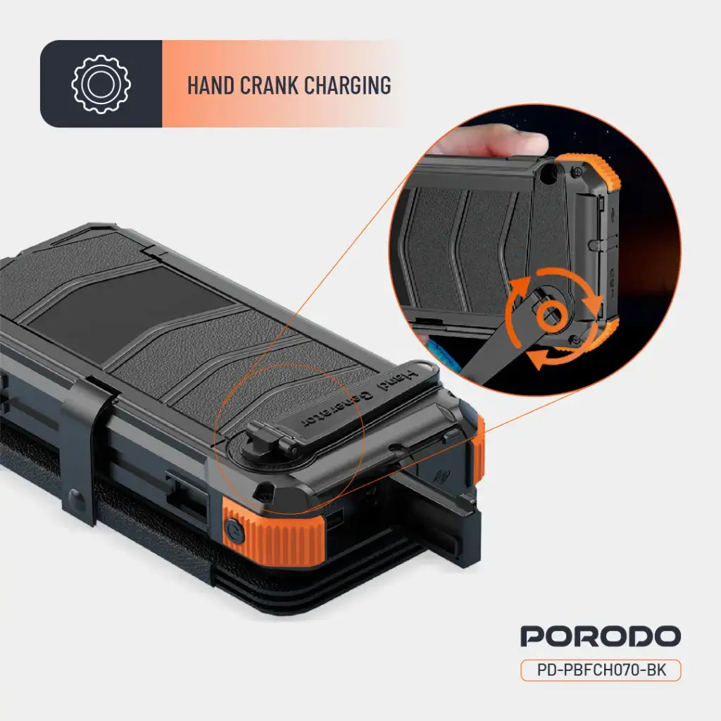 - يأتي الجهاز مزودًا بميزات إضافية مثل مولد يدوي (Hand Crank) للشحن في حالات الطوارئ، بالإضافة إلى كشاف متعدد الأوضاع مثالي للتخييم أو الاستخدام الليلي. صُمم ليكون مقاومًا للماء بمعيار IP45 وليتحمل درجات حرارة بين -10°C حتى 40°C، مما يجعله الخيار الأمثل للظروف القاسية والرحلات الخارجية.