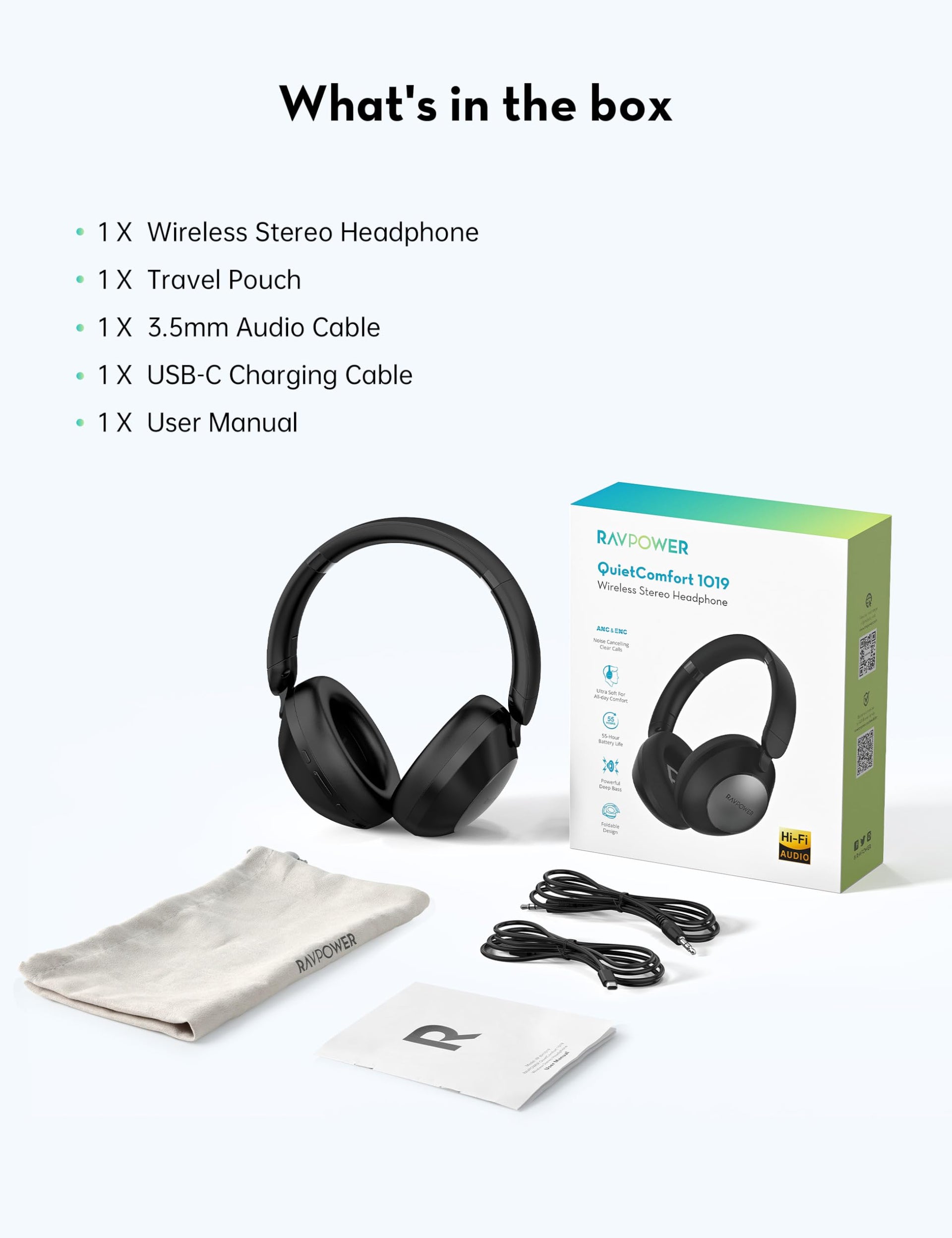 استمتع بتجربة صوت غير مسبوقة مع سماعات RAVPower BH1019 Quiet Comfort، المصممة لتقديم أعلى مستويات الراحة والصوت النقي أثناء العمل، السفر أو الاسترخاء.