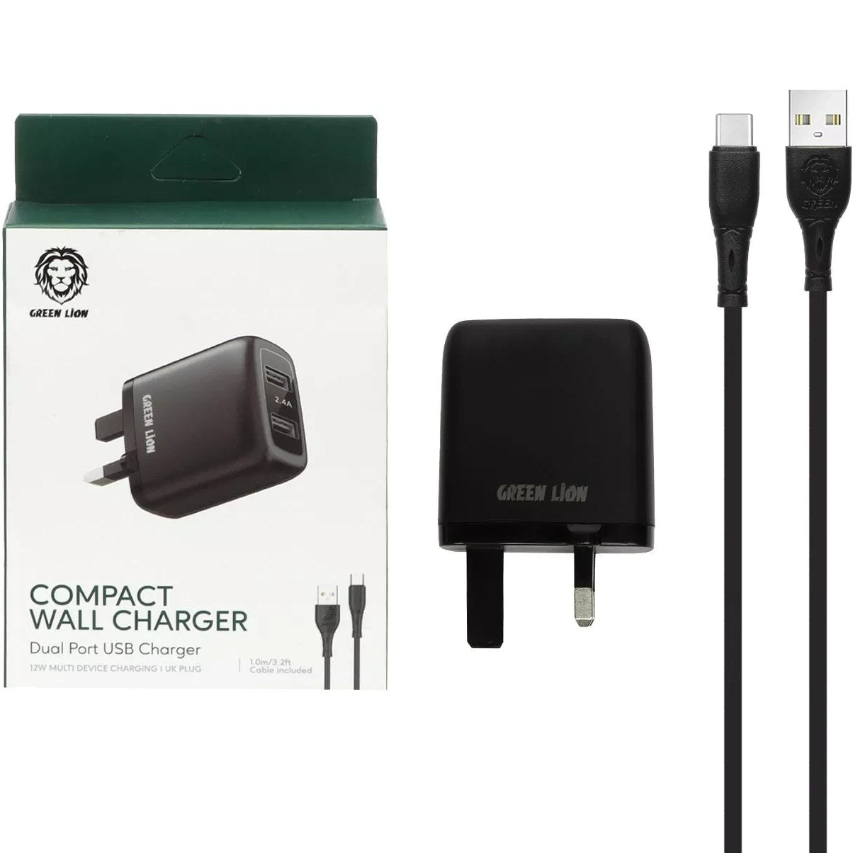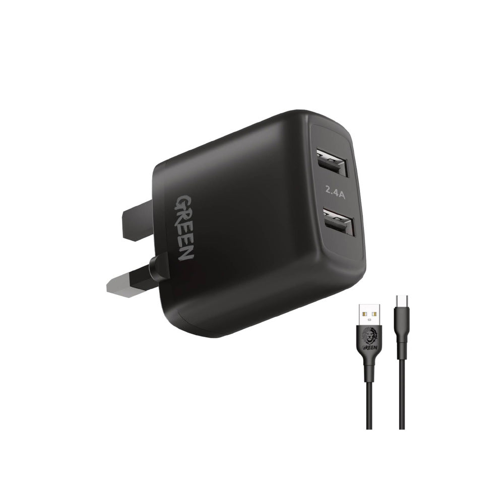 شاحن جرين لايون ثنائي المنفذ بقدرة 12 واط مع كيبل يو اس بي اي الى تايب سي بطول 1.2 متر - اسود | Green Lion Dual USB Port Wall Charger 12W UK with PVC Type-C Cable 1.2M – Black