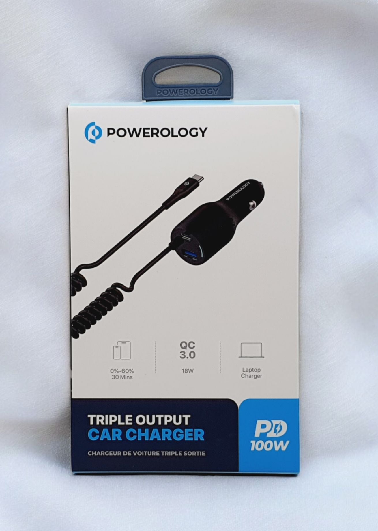 شاحن سيارة باورولوجي بمنفذ يو اس بي اي بقدرة 18 واط و يو اس بي سي بقدرة 100 واط مع كيبل تايب سي مدمج - اسود | Powerology PD100W + QC18W Dual Ports Car Charger with 20W Type-C Coiled Cable.