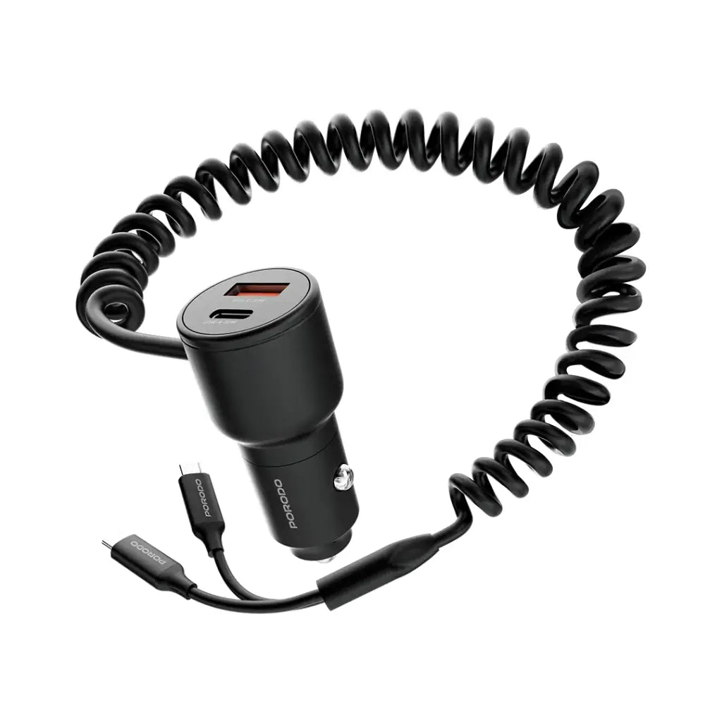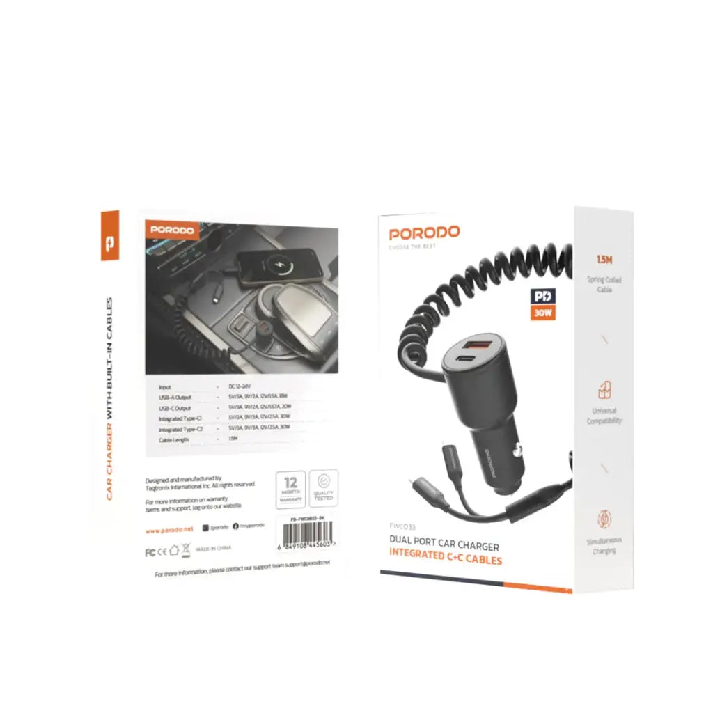 شاحن سيارة بورودو بمنفذين تايب سي و يو اس بي اي مع كيبل بمنفذين تايب سي بقدرة 30 وط - اسود | Porodo Type-C+A Car Charger with C+C Cable 30W – Black
