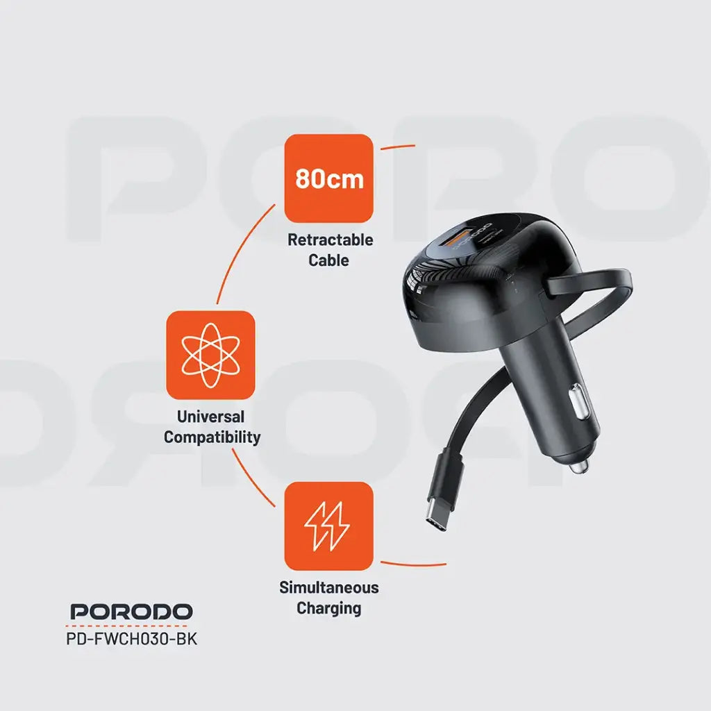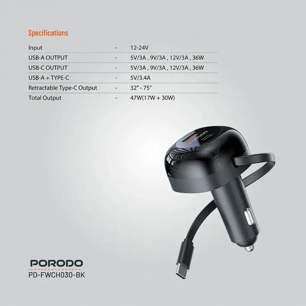 - استمتع بالشحن الأسرع والأكثر عملية أثناء القيادة مع شاحن السيارة القابل للسحب من بورودو. يتميز بتصميم مدمج مع كابل تايب-سي بطول 80 سم قابل للسحب، مما يوفر مرونة وسهولة في الاستخدام بدون فوضى الأسلاك. بفضل منافذ USB-A وUSB-C مع دعم تقنيات PD 36W وQC 36W، يوفر الشاحن قدرة إجمالية تصل إلى 47 واط لشحن هاتفك، جهازك اللوحي، أو أي جهاز متوافق بسرعة وكفاءة عالية.