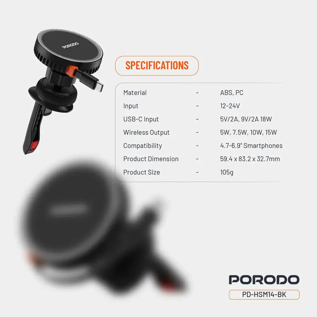 شاحن سيارة لاسلكي مغناطيسي من بورودو بقدرة شحن سريع 15 واط مع كيبل تايب سي قابل للسحب - اسود | Porodo 15W Retractable Magnetic Wireless Car Charger with Type-C Cable – Black