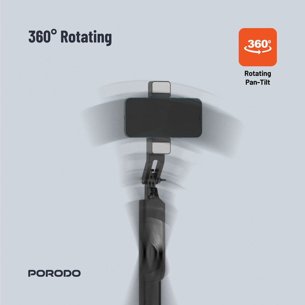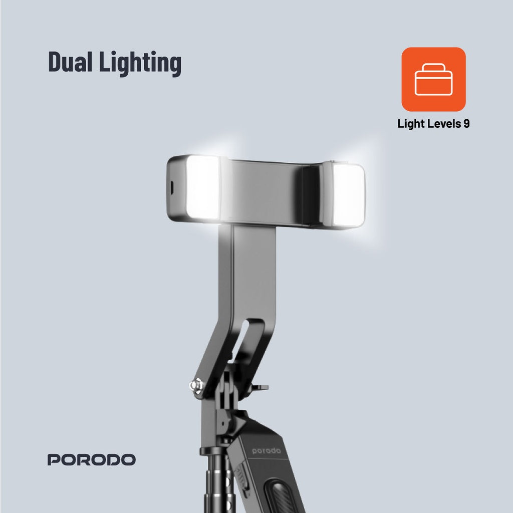عصا سيلفي قابلة للتمديد حتى 185 سم من بورودو مع اضائة مزدوجة وترايبود وريموت - اسود | Porodo Selfie Stick 185cm Extendable with Dual Detachable Lights, 4 Leg Tripod, and Remote Control - Black