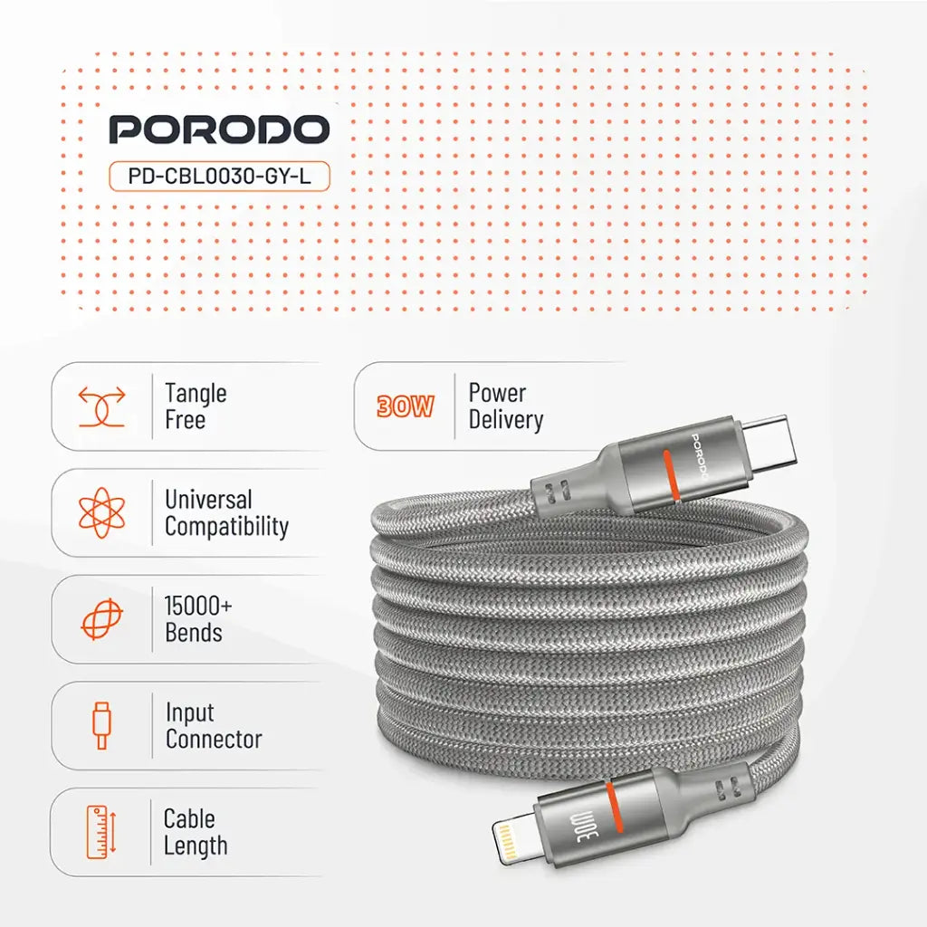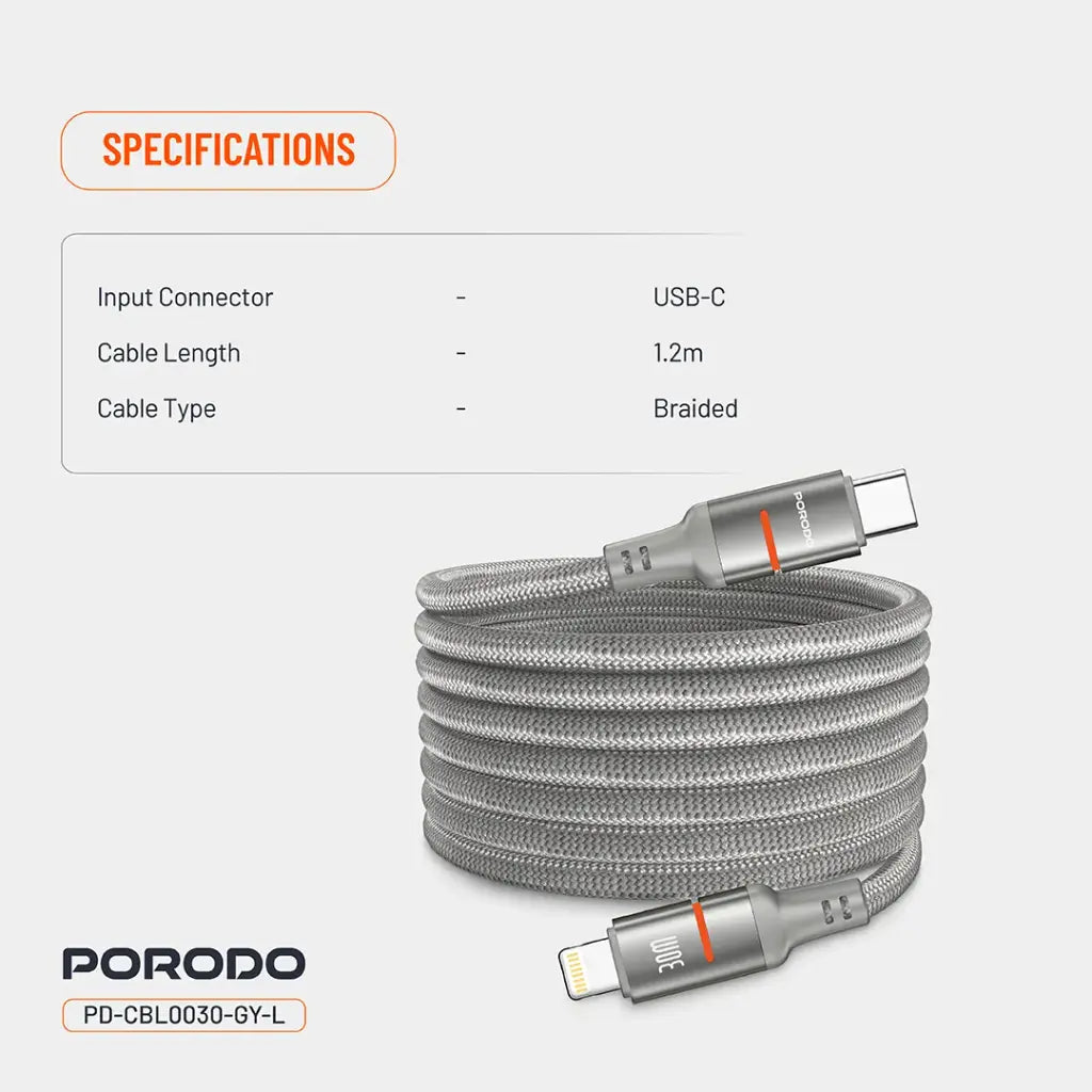 كيبل بورودو مغناطيسي مضفر تايب سي الى لايتننغ بشحن سريع 30 واط, بطول 1.2 متر - رمادي | Porodo 30W Type-C to Lightning Magnetic Braided Fast Charging Cable 1.2M – Grey