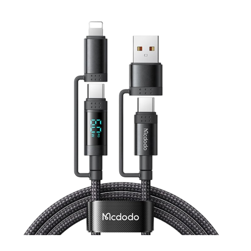 كيبل ماكدودو 4 في 1 هو الحل المثالي لتلبية جميع احتياجات الشحن المتعددة في جهاز واحد. بتصميم مبتكر يحتوي على موصلين USB-C في كلا الطرفين مع محوّل USB-A من جهة ومحوّل Lightning من جهة أخرى، يمكنك توصيل الكيبل بمجموعة واسعة من الأجهزة بكل سهولة.
