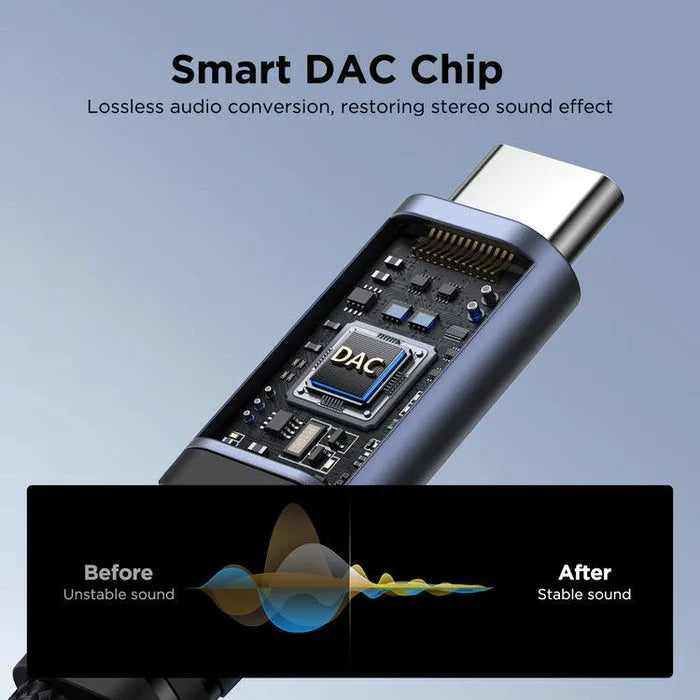 المحول مزود بشريحة DAC رقمية ذكية لضمان تحويل صوتي عالي الدقة وخالٍ من الفقدان، مع جودة ستيريو واضحة. يتميز بتصميم قوي من سبائك الألمنيوم مع غلاف نايلون مضفر مضاد للتآكل والانحناء، مما يمنحه عمر استخدام طويل يصل إلى 10,000+ مرة إدخال/إزالة و 10,000+ انحناء.